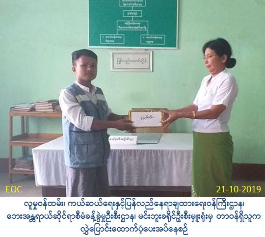 လူမှု၀န်ထမ်း၊ ကယ်ဆယ်ရေးနှင့်ပြန်လည်နေရာချထားရေး၀န်ကြီးဌာန၊ ဘေးအန္တရာယ်ဆိုင်ရာစီမံ ခန့်ခွဲမှုဦးစီးဌာန၊ မင်းဘူးခရိုင်ဦးစီးမှူးရုံးမှ တာဝန်ရှိသူများသည် မင်းဘူးမြို့နယ်၊ နိဗ္ဗာန်ကျွန်း ကျေးရွာတွင် (၂၀-၁၀-၂၀၁၉) ရက်နေ့၌ ဖြစ်ပွားခဲ့သော ဧရာဝတီမြစ်ရေတိုက်စား၍ ကမ်းပြိုဘေးကြောင့် ပြောင်းရွှေ့အိမ်ခြေ (၃) လုံး၊ အိမ်ထောင်စု(၃) စုတို့အတွက် အိမ်ဆောက်ပစ္စည်းဖိုး ငွေ (၃၀၀,၀၀၀/-) ကျပ်၊ လူဦးရေ (၁၆) ဦး အတွက် ဆန်ရိက္ခါ (၇) ရက်စာငွေ (၃၃,၆၀၀/-) ကျပ်၊ စုစုပေါင်းထောက်ပံ့ငွေ (၃၃၃,၆၀၀/-) ကျပ်အား (၂၁-၁၀-၂၀၁၉) ရက်နေ့ (၁၄:၄၅) အချိန်တွင် အထွေထွေအုပ်ချုပ်ရေးဦးစီးဌာနမှ တာဝန်ရှိသူများထံသို့ သွားရောက်လွှဲပြောင်းထောက်ပံ့ပေးအပ်ခဲ့ ပါကြောင်း သတင်းရရှိပါသည်။