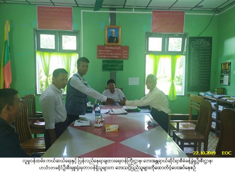 လူမှုဝန်ထမ်း၊ ကယ်ဆယ်ရေးနှင့် ပြန်လည်နေရာချထားရေးဝန်ကြီးဌာန၊ ဘေးအန္တရာယ်ဆိုင်ရာစီမံခန့်ခွဲမှုဦးစီး ဌာန၊ ဟင်္သာတခရိုင်ဦးစီးမှူးရုံးမှတာဝန်ရှိသူများသည် လေးမျက်နှာမြို့နယ်၊ ကညင်တိုင်းအုပ်စု၊ ဘန့်ဘွေးကုန်း ကျေးရွာ၌ (၁၇-၁၀-၂၀၁၉) နေ့တွင်ဖြစ်ပွားခဲ့သော လေဘေးကြောင့် တစ်စိတ်တစ်ပိုင်းပျက်စီး အိမ်ထောင်စု(၂)စု၊ လူဦးရေ (၉)ဦးအတွက် အိမ်ဆောက်ပစ္စည်းဖိုးထောက်ပံ့ငွေ (၅၀,၀၀၀/-) ကျပ်၊ ဆန်ရိက္ခာ(၇)ရက်စာဖိုး ထောက်ပံ့ငွေ (၁၈,၉၀၀/-) ကျပ်တို့ကို (၂၂-၁၀-၂၁၀၉) ရက်နေ့၊ (၁၃:၀၀) နာရီအချိန်တွင် သက်ဆိုင်ရာ တာဝန်ရှိသူများနှင့်အတူ လေးမျက်နှာမြို့နယ်၊ အထွေထွေအုပ်ချုပ်ရေးဉီးစီးဌာန၌ ထောက်ပံ့ပေးအပ်ခဲ့ပါကြောင်း သတင်းရရှိပါသည်။