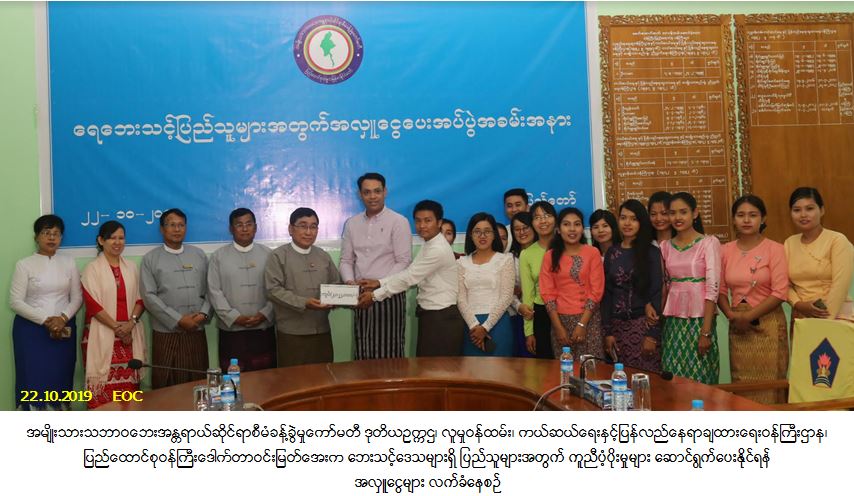 အမျိုးသားသဘာဝဘေးအန္တရာယ်ဆိုင်ရာ စီမံခန့်ခွဲမှုကော်မတီ ဒုတိယဥက္ကဌ၊ လူမှုဝန်ထမ်း၊ ကယ်ဆယ်ရေးနှင့်ပြန်လည်နေရာချထားရေးဝန်ကြီးဌာန၊ ပြည်ထောင်စုဝန်ကြီးဒေါက်တာဝင်းမြတ်အေးသည် ယနေ့မွန်းလွဲပိုင်းက ဝန်ကြီးရုံးအစည်းအဝေးခန်းမ၌ မြန်မာနိုင်ငံအတွင်းရှိ သဘာဝဘေးအန္တရာယ် ကျရောက်ခံစားခဲ့ရသော ဒေသများအတွင်းရှိ ဘေးသင့်ပြည်သူများအတွက် လှူဒါန်းငွေများကို လက်ခံခဲ့ပါသည်။