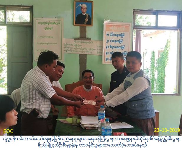လူမှု၀န်ထမ်း၊ ကယ်ဆယ်ရေးနှင့်ပြန်လည်နေရာချထားရေး၀န်ကြီးဌာန၊ ဘေးအန္တရာယ်ဆိုင်ရာ စီမံခန့်ခွဲမှုဦးစီးဌာန၊ မိုးညိုမြို့နယ်ဦးစီးမှူးရုံးမှ တာဝန်ရှိသူများသည် (၅-၁၀-၂၀၁၉) ရက်နေ့တွင် မိုးညိုမြို့နယ်၊ ရေကင်းကျေးရွာအုပ်စု၊ မင်းကြီးကျေးရွာတွင် လေပြင်းတိုက်ခတ်မှုကြောင့် သစ်ပင်ပိ၍အမိုးလန်နေအိမ် (၁) လုံးရှိ ဘေးသင့်လူဦးရေ (၃) ဦးအတွက်ဆန်ရိက္ခာဖိုးထောက်ပံ့ငွေ (၆,၃၀ဝ/-) ကျပ်အား (၂၃-၁၀-၂၀၁၉) ရက်နေ့ (၁ဝး၀၀) နာရီအချိန်တွင် ရေကင်းကျေးရွာအုပ်ချုပ်ရေး မှူးရုံးအစည်းအဝေးခန်းမ၌ အမျိုးသားလွှတ်တော်ကိုယ်စားလှယ်၊ သက်ဆိုင်ရာကျေးရွာအုပ်ချုပ် ရေးမှူး၊ တာဝန်ရှိသူများနှင့်အတူဘေးသင့်ပြည်သူများ၏ လက်၀ယ်အရောက်ထောက်ပံ့ပေးအပ်ခဲ့ပါကြောင်း သတင်းရရှိပါသည်။