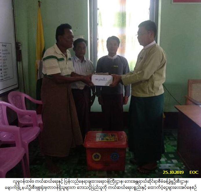 လူမှုဝန်ထမ်း၊ ကယ်ဆယ်ရေးနှင့် ပြန်လည်နေရာချထားရေးဝန်ကြီးဌာန၊ ဘေးအန္တရာယ်ဆိုင်ရာစီမံခန့်ခွဲမှုဦးစီး ဌာန၊ ချောက်မြို့နယ်ဦးစီးမှူးရုံးမှတာဝန်ရှိသူများသည် ချောက်မြို့နယ်၊ ပြည့်ပင်ကျေးရွာအုပ်စု၊ ပြည့်ပင်ကျေးရွာ၌ (၂၄-၁၀-၂၀၁၉) ရက်နေ့၊ (၁၆:၅၀) အချိန်တွင် ဖြစ်ပွားခဲ့သောမီးဘေးကြောင့် လုံးဝပျက် စီးနေအိမ်(၁)လုံး၊ အိမ်ထောင်စု (၁) စုမှ လူဦးရေ (၁) ဦးဘေးသင့်ခဲ့ရာ အဆိုပါဘေးသင့်ပြည်သူများအတွက် အိမ်ဆောက်ပစ္စည်းဖိုး ထောက်ပံ့ငွေ (၁၀၀,၀၀ဝ/-) ကျပ်၊ ဆန်ရိက္ခာဖိုး ထောက်ပံ့ငွေ (၂,၁၀ဝ/-) ကျပ်နှင့် ကယ်ဆယ်ရေးပစ္စည်း (၁၆) မျိုး (၁) အိမ်ထောင်စုစာတို့ကို (၂၅-၁၀-၂၀၁၉) ရက်နေ့တွင် ချောက်မြို့နယ်အထွေထွေအုပ်ချုပ်ရေးဦးစီးဌာမှ တာဝန်ရှိသူများနှင့်အတူ ဘေးသင့်ပြည်သူများလက်ဝယ်အရောက် ထောက်ပံ့ပေးခဲ့ပါကြောင်း သတင်းရရှိပါသည်။