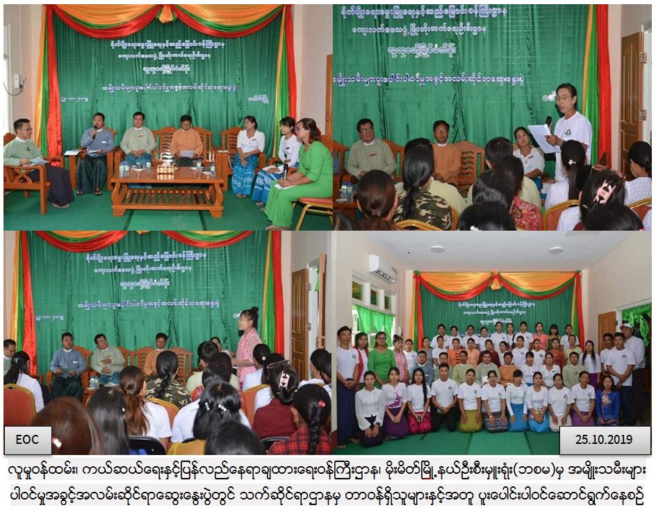 လူမှုဝန်ထမ်း၊ ကယ်ဆယ်ရေးနှင့်ပြန်လည်နေရာချထားရေးဝန်ကြီးဌာန၊ ဘေးအန္တရာယ်ဆိုင်ရာစီမံခန့်ခွဲမှုဦးစီးဌာန၊ မိုးမိတ်မြို့နယ်ဦးစီးမှူးရုံးမှ တာဝန်ရှိသူများသည် ကျေးလက်ဒေသဖွံ့ဖြိုးတိုးတက်ရေးဦးစီးဌာန၏ ကွပ်ကဲမှုဖြင့် ဆောင်ရွက်နေသည့် ရှမ်းပြည်နယ်မြောက်ပိုင်း၊ မဘိမ်းမြို့နယ်၊ လူထုဗဟိုပြုစီမံကိန်း၊ ဒုတိယနှစ်စီမံကိန်းစက်ဝန်း အကောင်အထည်ဖော်ဆောင်ရွက်လျက်ရှိသည့် ဖွံ့ဖြိုးရေးလုပ်ငန်းများတွင် အမျိုးသမီးများပူးပေါင်းပါဝင်လာစေရန်၊ ဒေသတွင်း လက်ရှိ လုပ်ဆောင်နေသော လုပ်ငန်းများတွင် အမျိုးသမီးများ ပိုမိုပူးပေါင်းပါဝင်ဆောင်ရွက်လာနိုင်စေရန်၊ အမျိုးသမီးများ ဘဝဖွံ့ဖြိုးတိုးတက်ရေးအတွက် အခွင့်အလမ်းပိုမိုကောင်းမွန်လာစေသော ပံ့ပိုးပေးနိုင်မည့် ပတ်ဝန်းကျင်တစ်ခုဖြစ်ပေါ်လာစေရန် ရည်ရွယ်၍ (၂၅.၁၀.၂၀၁၉)ရက်နေ့တွင် ကျင်းပပြုလုပ်ခဲ့သော အမျိုးသမီးများပူးပေါင်းပါဝင်မှု အခွင့်အလမ်းဆိုင်ရာ ဆွေးနွေးပွဲကို တက်ရောက်ဆွေးနွေးခဲ့ရာ တက်ရောက်လာကြသော ကျေးရွာအုပ်စု(၁၆)အုပ်စုမှ အမျိုးသမီးကွန်ရက်များအား ဝန်ကြီးဌာန၏ မူဝါဒများ၊ ဦးစီးဌာန၏ မူဝါဒ၊ ရည်ရွယ်ချက်၊ လုပ်ငန်းတာဝန်များကို ရှင်းလင်းပြောကြားခြင်းများ၊ ဆွေးနွေးပွဲတွင်ဖိတ်ကြားထားသောကိုယ်စားလှယ်များနှင့် ကွန်ရက်အဖွဲ့မှ သိရှိလိုသည့်မေးခွန်းများအား တက်ကြွစွာဖြေဆိုခဲ့ပြီး သဘာဝဘေးအန္တရာယ်ဆိုင်ရာရှေ့လုပ်ငန်းစဉ်များတွင်လည်း အမျိုးသမီးကွန်ရက်များနှင့်ချိတ်ဆက်ဆောက်ရွက်သွားမည်ဟု ဆွေးနွေးခဲ့ပါကြောင်းသတင်းရရှိပါသည်။