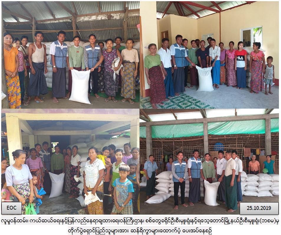 လူမှုဝန်ထမ်း၊ ကယ်ဆယ်ရေးနှင့်ပြန်လည်နေရာချထားရေးဝန်ကြီးဌာန၊ ဘေးအန ္တရာယ်ဆိုင်ရာစီမံခန့်ခွဲမှုဦးစီးဌာန၊ စစ်တွေခရိုင်ဦးစီးမှူးရုံးနှင့် ရသေ့တောင်မြို့နယ်ဦးစီးမှူးရုံးမှ တာဝန်ရှိသူများသည် ရခိုင်ပြည်နယ်၊ ရသေ့တောင်မြို့နယ်အတွင်းရှိ တိုက်ပွဲရှောင်ပြည်သူများ နေရပ်စွန့်ခွာပြီး ယာယီခိုလှုံနေထိုင်လျက်ရှိသည့် စုရပ်(၁၈)ခုမှ တိုက်ပွဲရှောင် အိမ်ထောင်စု(၁၀၄၀)စု၊ လူဦးရေ(၄၃၂၈)ဦးအတွက် ဆန်ရိက္ခာ(၁)လစာ ဆန်(၁၃၅၂)အိတ်၊ (၁၂)ပြည်အား (၂၅.၁၀.၂၀၁၉)ရက်တွင် စစ်တွေခရိုင်ဦးစီးမှူးရုံးမှတာဝန်ရှိသူများနှင့် ရသေ့တောင်မြို့နယ်ဦးစီးမှူးရုံးမှ တာဝန်ရှိသူများသည် ရသေ့တောင်မြို့နယ်အထွေထွေအုပ်ချုပ်ရေးဦးစီးဌာနမှ တာဝန်ရှိသူများနှင့် ရပ်ကျေးအုပ်ချုပ်ရေးမှူးတို့ဖြင့် တိုက်ပွဲရှောင်ပြည်သူများအား ထောက်ပံ့ပေးအပ်ခဲ့ကြောင်း သတင်းရရှိပါသည်။