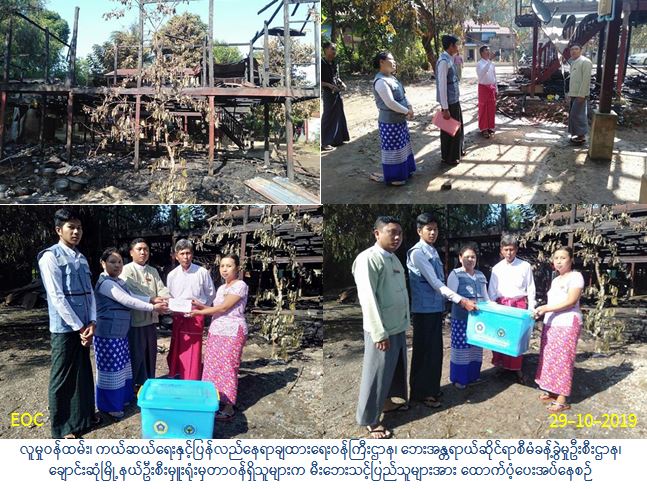 လူမှု၀န်ထမ်း၊ ကယ်ဆယ်ရေးနှင့်ပြန်လည်နေရာချထားရေး၀န်ကြီးဌာန၊ ဘေးအန္တရာယ်ဆိုင်ရာ စီမံခန့်ခွဲမှုဦးစီးဌာန၊ ချောင်းဆုံမြို့နယ်ဦးစီးမှူးရုံးရှိတာဝန်ရှိသူများသည် (၂၈-၁၀-၂၀၁၉) ရက်နေ့တွင် ချောင်းဆုံမြို့နယ်၊ မုဒူးကျေးရွာအုပ်စု၌ မီးလောင်ကျွမ်းမှုကြောင့် ပျက်စီးဆုံးရှုံးခဲ့သည့် လူနေအိမ် (၁) လုံးအတွက် အိမ်ဆောက်ပစ္စည်းဖိုးငွေ (၂၀၀၀၀ဝ/-)ကျပ်၊ ဘေးသင့်လူဦးရေ (၅) ဦးအတွက်(၇) ရက်စာဆန်ရိက္ခာဖိုးငွေ (၁၀၅၀ဝ/-) ကျပ်၊ စုစုပေါင်းထောက်ပံ့ငွေ (၂၁၀၅၀ဝ/-) ကျပ် နှင့် ကယ်ဆယ်ရေးပစ္စည်း (၁၇) မျိုးတို့အား (၂၉-၁၀-၂၀၁၉) ရက်နေ့တွင် မွန်ပြည်နယ်လွှတ်တော် ဒုတိယဥက္ကဌ၊ မြို့နယ်အထွေထွေအုပ်ချုပ်ရေးဦးစီးဌာနတို့နှင့်ပူးပေါင်း၍ မီးဘေးသင့်ပြည်သူများ လက်ဝယ်အရောက် ထောက်ပံ့ပေးအပ်ခဲ့ပါကြောင်း သတင်းရရှိပါသည်။
