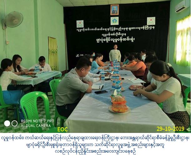 လူမှု၀န်ထမ်း၊ ကယ်ဆယ်ရေးနှင့်ပြန်လည်နေရာချထားရေး၀န်ကြီးဌာန၊ ဘေးအန္တရာယ်ဆိုင်ရာ စီမံခန့်ခွဲမှုဦးစီးဌာန၊ ဖျာပုံခရိုင်ဦးစီးမှူးရုံးမှတာဝန်ရှိသူများသည် အောက်တိုဘာလ (၂၉) ရက်နေ့တွင် ဖျာပုံခရိုင် လူမှုဝန်ထမ်းဦးစီးဌာနအစည်းအဝေးခန်းမ၌ ဖျာပုံခရိုင်အတွင်းရှိ NGO၊ INGO များ၊ လူမှုရေး အဖွဲ့အစည်းများနှင့် လစဉ်လုပ်ငန်းညှိနှိုင်းအစည်းအဝေးကိုကျင်းပခဲ့ရာ ဘေးအန္တရာယ်ဆိုင်ရာစီမံခန့်ခွဲမှု ဦးစီးဌာနမှ လက်ရှိဆောင်ရွက်နေမှုအခြေအနေများ၊ ရှေ့ဆက်ဆောင်ရွက်မည့်လုပ်ငန်းစည်များအား ရှင်းလင်းပြောကြားခဲ့ပြီး တက်ရောက်လာကြသည့်လူမှုအဖွဲ့အစည်းများမှ လည်းလုပ်ငန်းစဉ်များအား အသီးသီးချပြဆွေးနွေးခဲ့ပါကြောင်း သတင်းရရှိပါသည်။
