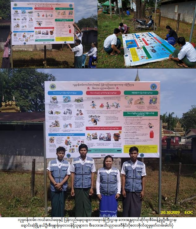 လူမှုဝန်ထမ်း၊ ကယ်ဆယ်ရေးနှင့် ပြန်လည်နေရာချထားရေးဝန်ကြီးဌာန၊ ဘေးအန္တရာယ်ဆိုင်ရာစီမံခန့်ခွဲမှုဦးစီး ဌာန၊ ချောင်းဆုံမြို့နယ်ဦးစီးမှူးရုံးမှတာဝန်ရှိသူများသည် (၃၀-၁၀-၂၀၁၉) ရက်နေ့တွင် ချောင်းဆုံမြို့နယ်၊ ကညှော်ကျေးရွာ၊ ဘော်လုံးကွင်းအရှေ့၊ စျေးအနီး၌ စိုက်ထူထားသော ရေဘေးအသိပညာပေးဗီနိုင်းပိုစတာ နေရာတွင် မီးဘေးအသိပညာပေးဗီနိုင်းပိုစတာကို ပြောင်းလဲစိုက်ထူခဲ့ပါကြောင်းသတင်းရရှိပါသည်။