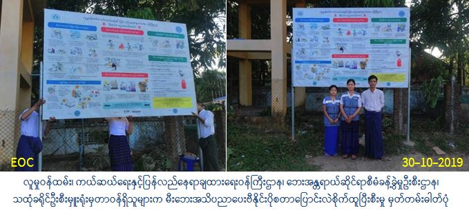 လူမှု၀န်ထမ်း၊ ကယ်ဆယ်ရေးနှင့်ပြန်လည်နေရာချထားရေး၀န်ကြီးဌာန၊ ဘေးအန္တရာယ်ဆိုင်ရာ စီမံခန့်ခွဲမှုဦးစီးဌာန၊ သထုံခရိုင်ဦးစီးမှူးရုံးမှ တာဝန်ရှိသူများသည် မွန်ပြည်နယ်၊ ပေါင်မြို့နယ်နှင့် သထုံမြို့နယ်တို့၌ ယခင်စိုက်ထူထားသော ရေဘေးအသိပညာပေးဗီနိုင်းပိုစတာအစား မီးဘေး အသိပညာပေးဗီနိုင်းပိုစတာအား (၃၀-၁၀-၂၀၁၉) ရက်နေ့တွင် ပြောင်းလဲစိုက်ထူပြီးစီးပြီးဖြစ်ပါ ကြောင်း သတင်းရရှိပါသည်။