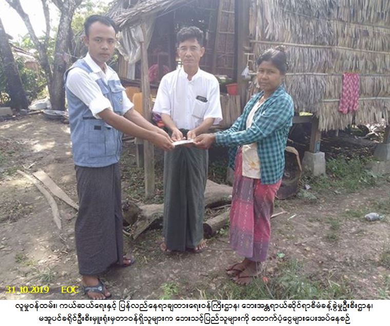 လူမှုဝန်ထမ်း၊ ကယ်ဆယ်ရေးနှင့် ပြန်လည်နေရာချထားရေးဝန်ကြီးဌာန၊ ဘေးအန္တရာယ်ဆိုင်ရာစီမံခန့်ခွဲမှုဦးစီး ဌာန၊ မအူပင်ခရိုင်ဦးစီးမှူးရုံးမှတာဝန်ရှိသူများသည် မအူပင်ခရိုင်၊ မအူပင်မြို့နယ်၊ တလုပ်လပ်အနောက် ကျေးရွာအုပ်စု၊ အောက်ပိုင်းကျေးရွာ၌ (၃၀-၁၀-၂၀၁၉) ရက်နေတွင် ဖြစ်ပွားခဲ့သောလေဘေးကြောင့် အမိုးလန်ပျက်စီးနေအိမ်(၁)လုံး၊ အိမ်ထောင်စု(၁)စုမှ လူဉီးရေ(၆)ဦးဘေးသင့်ခဲ့ရာ အဆိုပါဘေးသင့်ပြည်သူများ အတွက် ဆန်ရိက္ခာဖိုးထောက်ပံ့ငွေ (၁၂,၆၀၀/-) ကျပ်နှင့် အိမ်ဆောက်ပစ္စည်းဖိုးထောက်ပံ့ငွေ (၃၀,၀၀၀/-) ကျပ်တို့ကို (၃၁-၁၀-၂၀၁၉) ရက်နေ့၊ (၁၄:၀၀)နာရီအချိန်တွင် ဘေးသင့်ပြည်သူများလက်ဝယ်အရောက် ထောက်ပံ့ပေးအပ်ခဲ့ပါကြောင်းသတင်းရရှိပါသည်။