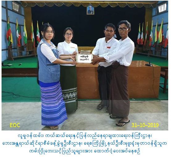 လူမှု၀န်ထမ်း၊ ကယ်ဆယ်ရေးနှင့်ပြန်လည်နေရာချထားရေး၀န်ကြီးဌာန၊ ဘေးအန္တရာယ် ဆိုင်ရာစီမံခန့်ခွဲမှုဦးစီးဌာန၊ ရေစကြိုမြို့နယ်ဦးစီးမှူးရုံးမှ တာဝန်ရှိသူများသည် (၂-၁၀-၂၀၁၉) မှ (၂၂-၁၀-၂၀၁၉) ရက်နေ့အထိ ဧရာဝတီမြစ်ရေနှင့် ချင်းတွင်းမြစ်ရေတိုက်းစားမှု ကြောင့် ငါးလန်ကျေးရွာအုပ်စု ငါးလန်ကျေးရွာ၊ နွယ်နီကျေးရွာအုပ်စု နွယ်နီကျွန်းကျေးရွာ၊ မိုးကွဲကျေးရွာအုပ်စု၊ ချင်းယားကျေးရွာနှင့် ကွေ့ထောင့်ကျေးရွာအုပ်စု ကွေ့ထောင့်ကျေး ရွာတို့တွင် ကမ်းပြိုဘေးသင့်ဖြစ်ပွားခဲ့ရာ အိမ်ခြေ (၃၄) အိမ်၊ အိမ်ထောင်စု (၃၉) စုမှ လူဦးရေ (၁၆၃) ဦးတို့အတွက် အိမ်ဆောက်ပစ္စည်းဖိုးထောက်ပံ့ငွေ (၃၄၀၀၀၀၀/-) ကျပ်နှင့် ဆန်ရိက္ခာဖိုးထောက်ပံ့ငွေ (၃၄၂၃၀၀/-) ကျပ်တို့အား (၃၁-၁၀-၂၀၁၉)ရက်နေ့တွင် မြို့နယ်အထွေထွေအုပ်ချုပ်းရေးဌာနအစည်းအဝေးခန်းမတွင် ထောက်ပံ့ပေးအပ်ခဲ့ပါ ကြောင်းသတင်းရရှိပါသည်။