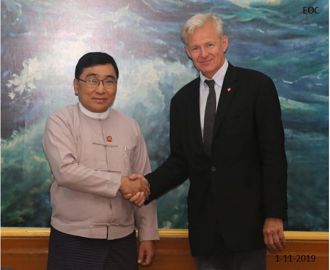 လူမှုဝန်ထမ်း၊ ကယ်ဆယ်ရေးနှင့် ပြန်လည်နေရာချထားရေးဝန်ကြီးဌာန ပြည်ထောင်စုဝန်ကြီး ဒေါက်တာဝင်းမြတ်အေးအား (NRC- Norwegian Refugee Council)၏ အထွေထွေအတွင်းရေးမှူးချုပ် ဖြစ်သူ Mr. Jan Laurits Egeland ဦးဆောင်သောအဖွဲ့က ယနေ့နံနက်ပိုင်းတွင် အဆိုပါဝန်ကြီးရုံး မေခလာ ခန်းမ၌ လာရောက်တွေ့ဆုံပါသည်။