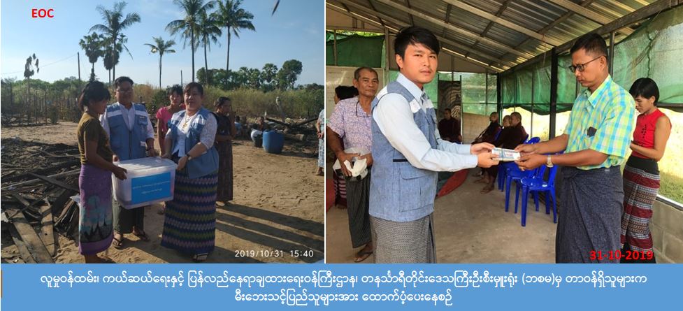 လူမှု၀န်ထမ်း၊ ကယ်ဆယ်ရေးနှင့်ပြန်လည်နေရာချထားရေး၀န်ကြီးဌာန၊ ဘေးအန္တရာယ် ဆိုင်ရာစီမံခန့်ခွဲမှုဦးစီးဌာန၊ တနင်္သာရီတိုင်းဒေသကြီးဦးစီးမှူးရုံးမှ တာဝန်ရှိသူများသည် ထားဝယ်ခရိုင်၊ လောင်းလုံးမြို့နယ်၊ မောင်းမကန်ကျေးရွာ တွင် (၃၁-၁၀-၂၀၁၉) ရက်နေ့ဖြစ်ပွားခဲ့သော မီးဘေးကြောင့် ဘေးသင့်အိမ်ခြေ (၈) လုံးအတွက် အိမ်ဆောက် ပစ္စည်းဖိုးထောက်ပံ့ငွေ ( ၈၀၀,၀၀၀) ကျပ်၊ လူဦးရေ (၃၁) ဦးအတွက် ဆန်ရိက္ခာ (၇) ရက်စာဖိုး ထောက်ပံ့ငွေ (၆၅,၁၀၀) ကျပ်၊ စုစုပေါင်းထောက်ပံ့ငွေ (၈၆၅,၁၀၀) ကျပ်ကို (၁-၁၁-၂၀၁၉)ရက်နေ့ (၁၅:၀၀)အချိန်တွင်လည်းကောင်း၊ ကယ်ဆယ်ရေးပစ္စည်း (၁၇) မျိုး အိမ်ထောင်စု (၈) စုစာတို့အား (၃၁-၁၀-၂၀၁၉) ရက်နေ့ (၁၅:၀၀) နာရီအချိန် လည်းကောင်း ဘေးသင့်ပြည်သူများ၏လက်ဝယ်အရောက် ထောက်ပံ့ပေးအပ်ခဲ့ပါကြောင်း သိရှိရပါသည်။