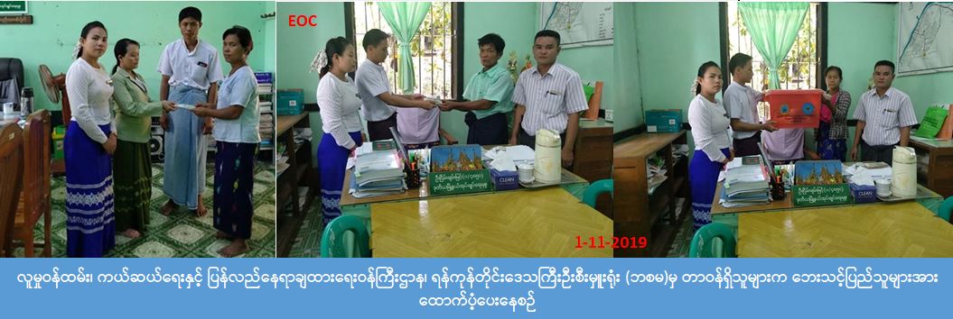 ရန်ကုန်တောင်ပိုင်းခရိုင်၊ ကွမ်းခြံကုန်းမြို့နယ်၊ တောင်ဘက်ပိုင်းရပ်ကွက်တွင် (၂၉-၁၀-၂၀၁၉)ရက်နေ့(၁၈:၀၀)နာရီ အချိန်၌ မိုးကြိုးထိမှန်မှုကြောင့် (ဘ)ဦးဘကြိုင်(သား)ဉီးဇော်မင်းထွန်းအသက်(၃၅)နှစ်မှာ သေဆုံးခဲ့သောကြောင့် ထောက်ပံ့ငွေ (၃၀၀,၀၀၀)ကျပ်နှင့် တွံတေးမြို့နယ်၊ မာလကာရာဘာခြံကျေးရွာအုပ်စု၊ ဆယ်အိမ်စုကျေးရွာတွင် (၃၁-၁၀-၂၀၁၉) ရက်နေ့ (၁၅:၄၅) နာရီအချိန်တွင် လေပြင်းတိုက်ခတ်၍ ပြိုကျကျက်စီးအိမ်ခြေ(၁)လုံး အမိုးလန် အိမ်ခြေ (၁) လုံး တို့အတွက် အိမ်ဆောက်ပစ္စည်းဖိုးထောက်ပံ့ငွေကျပ်(၁၀၀,၀၀ဝ)ကျပ်၊ အိမ်ထောင်စု(၂)စုမှ လူဉီးရေ (၈) ဉီးအတွက် ဆန်ရိက္ခာဖိုးထောက်ပံ့ငွေကျပ် (၁၆,၈၀ဝ)ကျပ်နှင့် ကယ်ဆယ်ရေးပစ္စည်း(၁၁)မျိုး (၁)အိမ်ထောင်စုစာ စုစုပေါင်း ထောက်ပံ့ငွေ (၄၁၆,၈၀၀)ကျပ်တို့အား (၁-၁၁-၂၀၁၉)ရက်နေ့တွင် ဘေးအန္တရာယ်ဆိုင်ရာစီမံခန့်ခွဲမှုဉီးစီး ဌာန၊ရန်ကုန်တိုင်းဒေသကြီးဉီးစီးမှူးရုံး(ဘစမ)မှ တာဝန်ရှိသူများ၊ အထွေထွေအုပ်ချုပ်ရေးဉီးစီးဌာမှ တာဝန်ရှိသူများနှင့် အတူ ဘေးသင့်ပြည်သူများထံသို့ သွားရောက်၍ထောက်ပံ့ပေးခဲ့ကြောင်း သိရှိရပါသည်။