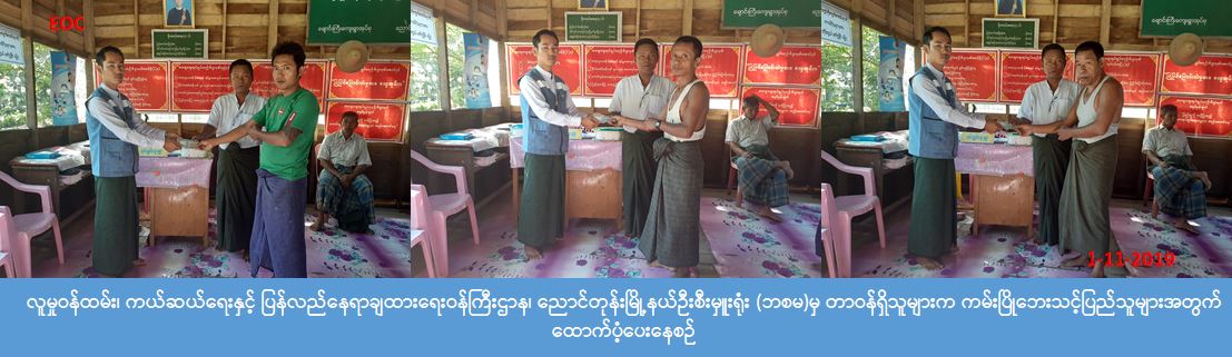 လူမှုဝန်ထမ်း၊ ကယ်ဆယ်ရေးနှင့်ပြန်လည်နေရာချထားရေးဝန်ကြီးဌာန၊ ဘေးအန္တရာယ်ဆိုင်ရာစီမံခန့်ခွဲမှု ဦးစီး ဌာန၊ ညောင်တုန်းမြို့နယ်ဦးစီးမှူးရုံးမှ တာဝန်ရှိသူများသည် ညောင်တုန်းမြို့နယ်၊ ချောင်းကြီးကျေးရွာအုပ်စု၊ ချောင်းကြီးကျေးရွာ၌ (၃၁-၁၀-၂၀၁၉) ရက်နေ့တွင်ဖြစ်ပွားခဲ့သော ကမ်းပြိုဘေးကြောင့် ဖျက်သိမ်းပြောင်းရွှေ့ခဲ့ သည့်နေအိမ် (၃)လုံး၊ အိမ်ထောင်စု (၃)စုမှ လူဦးရေ (၁၂) ဦးအတွက် ဆန်ရိက္ခာ၇ရက်စာ (၂၅,၂၀၀) ကျပ်၊ အိမ် ဆောက် ပစ္စည်းဖိုး(၃၀၀,၀၀၀)ကျပ်၊ စုစုပေါင်း ရန်ပုံငွေ (၃၂၅,၂၀၀)ကျပ်အား (၁-၁၁-၂၁၀၉)ရက်နေ့ (၀၉:၃၀)နာရီအချိန်တွင် တာဝန်ရှိသူများနှင့်အတူကမ်းပြို ဘေးသင့်ပြည်သူများလက်ဝယ်သို့ ထောက်ပံ့ပေးအပ် ခဲ့ကြောင်း သိရှိရပါသည်။