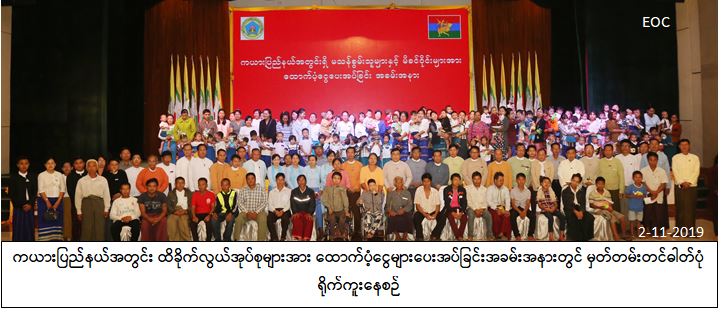 ကယားပြည်နယ်အတွင်းရှိ မသန်စွမ်းသူများနှင့် မိခင်ဝိုင်းများအား လူမှုကာကွယ် စောင့်ရှောက်ရေး အထောက်အပံ့များပေးအပ်ပွဲကို ယနေ့နံနက်ပိုင်းက လွိုင်ကော်မြို့၊ ပြည်နယ်အစိုးရခန်းမ၌ကျင်းပရာ လူမှုဝန်ထမ်း၊ ကယ်ဆယ်ရေးနှင့်ပြန်လည်နေရာချထားရေး ဝန်ကြီးဌာန ပြည်ထောင်စုဝန်ကြီးဒေါက်တာဝင်းမြတ်အေး၊ ကယားပြည်နယ်အစိုးရအဖွဲ့ ဝန်ကြီးချုပ်ဦးအယ်ဖောင်းရှို၊ ဒုတိယဝန်ကြီးဦးစိုးအောင်၊ ကယားပြည်နယ် အစိုးရအဖွဲ့ဝင် ဝန်ကြီးများနှင့် တာဝန်ရှိသူများ တက်ရောက်ခဲ့ကြပါသည်။