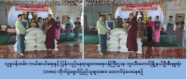 ဘူးသီးတောင်မြို့၊ ရွာမရပ်ကွက်၊ သီရိမင်္ဂလာရွာမဘုန်း တော်ကြီးကျောင်းရှိ တိုက်ပွဲရှောင် ကျောင်းသား၊ ကျောင်းသူ (၄၉) ဦးအတွက် ဆန်ရိက္ခာ (၁)လစာ ဆန် (၁၅) အိတ်၊ (၇) ပြည်၊ (၄) ဘူးအား (၂-၁၁-၂၀၁၉) ရက်နေ့တွင် လူမှုဝန်ထမ်း၊ ကယ်ဆယ်ရေးနှင့် ပြန်လည်နေရာ ချ ထားရေးဝန်ကြီးဌာန၊ ဘေးအန္တရာယ်ဆိုင်ရာ စီမံခန့်ခွဲမှုဦးစီးဌာန၊ ဘူးသီးတောင်မြို့နယ် ဦးစီးမှူးရုံးမှ ဘူးသီးတောင်မြို့နယ်ဒုတိယမြို့နယ်အုပ်ချုပ်ရေးမှူး နှင့်အတူထောက်ပံ့ပေး အပ်ခဲ့ကြောင်း သိရှိရပါသည်။