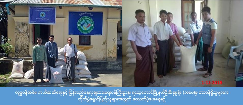 ရခိုင်ပြည်နယ်၊ ရသေ့တောင်မြို့နယ်အတွင်းရှိ တိုက်ပွဲရှောင်ပြည်သူများ နေရပ်စွန့်ခွာပြီး ယာယီခိုလှုံနေထိုင်လျက် ရှိသည့် စုရပ် (၆) ခုမှ တိုက်ပွဲရှောင် အိမ်ထောင်စု (၂၄၀) စု၊ လူဦးရေ (၉၁၈) ဦးအတွက် ဆန်ရိက္ခာ (၁) လစာ ဆန် (၂၈၆) အိတ်၊ (၂၁) ပြည်အား (၁-၁၁-၂၀၁၉)ရက်တွင် လူမှုဝန်ထမ်း၊ ကယ်ဆယ်ရေးနှင့်ပြန်လည် နေရာချထားရေးဝန်ကြီးဌာန၊ ဘေးအန္တရာယ်ဆိုင်ရာစီမံခန့်ခွဲမှုဦးစီးဌာန၊ ရသေ့တောင်မြို့နယ် ဦးစီးမှူးရုံးမှ တာဝန်ရှိသူများသည် ရသေ့တောင်မြို့နယ် အထွေထွေအုပ်ချုပ်ရေးဦးစီးဌာနမှ တာဝန်ရှိသူများနှင့် ရပ်ကျေးအုပ်ချုပ်ရေးမှူးတို့ဖြင့် တိုက်ပွဲရှောင်ပြည်သူများအား ဖြန့်ခွဲထောက်ပံ့ပေးအပ်ခဲ့ကြောင်း သိရှိရပါသည်။