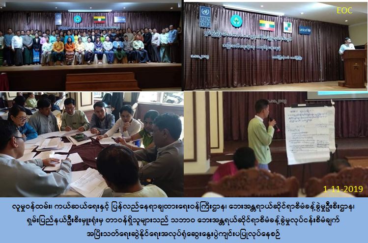 လူမှုဝန်ထမ်း၊ ကယ်ဆယ်ရေးနှင့် ပြန်လည်နေရာချထားရေးဝန်ကြီးဌာန၊ ဘေးအန္တရာယ် ဆိုင်ရာစီမံခန့်ခွဲမှုဦးစီးဌာန၊ရှမ်းပြည်နယ်ဦးစီးမှူးရုံးမှတာဝန်ရှိသူများသည် ရှမ်းပြည်နယ် သဘာဝဘေးအန္တရာယ်ဆိုင်ရာစီမံခန့်ခွဲမှုလုပ်ငန်းစီမံချက် အပြီးသတ်ရေးဆွဲနိုင်ရေး အလုပ်ရုံဆွေးနွေးပွဲကို ရှမ်းပြည်နယ်၊ တောင်ကြီးမြို့ (Taunggyi Hotel) ၌ (၁-၁၁-၂၀၁၉) ရက်နေ့တွင်ကျင်းပပြုလုပ်ခဲ့ပါသည်။ အဆိုပါအလုပ်ရုံဆွေးနွေးပွဲကို ရှမ်းပြည်နယ်အစိုးရ အဖွဲ့ဝင်ဗမာတိုင်းရင်းသားလူမျိုးရေးရာဝန်ကြီးက အဖွင့်အမှာစကားပြောကြားခဲ့ပြီး ပြည် နယ်ဘေးအန္တရာယ်ဆိုင်ရာစီမံခန့်ခွဲမှုဦးစီးဌာန၊ ပြည်နယ်/ခရိုင် အဆင့်ဌာနဆိုင်ရာများ၊ (UNDP၊ UNICEF၊ UNOCHA) နှင့် အခြားလူမှုအဖွဲ့အစည်းများမှ တာဝန်ရှိသူများ စုစုပေါင်း (၆၀) ဦးခန့် တက်ရောက်ခဲ့ပါကြောင်းသိရှိရပါသည်။