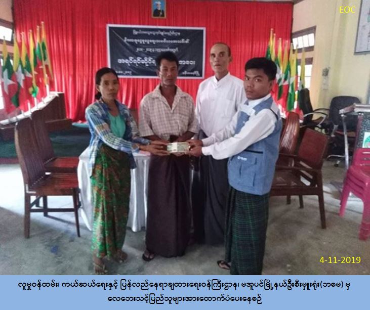 လူမှုဝန်ထမ်း၊ ကယ်ဆယ်ရေးနှင့် ပြန်လည်နေရာချထားရေးဝန်ကြီးဌာန၊ ဘေးအန္တရာယ် ဆိုင်ရာ စီမံခန့်ခွဲမှုဦးစီးဌာန၊ မအူပင်ခရိုင်ဦးစီးမှူးရုံးမှ တာဝန်ရှိသူများသည် မအူပင်ခရိုင်၊ ပန်းတနော်မြို့နယ်၊ ဆင်လမ်းကြီးကျေးရွာအုပ်စု၊ ဆင်လမ်းကြီးကျေးရွာနှင့် မဿမံ ကျေးရွာတို့၌ (၁-၁၁-၂၀၁၉) ရက်နေ့တွင် ဖြစ်ပွားခဲ့သော လေဘေးကြောင့် အမိုးလန် ပျက်စီးခဲ့သည့်နေအိမ် (၅) လုံး၊ အိမ်ထောင် (၅) စုမှ လူဦးရေ (၁၈) ဦးအတွက် ဆန်ရိက္ခာဖိုး (၃၇,၈၀ဝ) ကျပ်၊ အိမ်ဆောက် ပစ္စည်းဖိုး (၁၅၀,၀၀ဝ) ကျပ်၊ စုစုပေါင်းရန်ပုံငွေ (၁၈၇,၈၀ဝ) ကျပ်အား (၄-၁၁-၂၀၁၉) ရက်နေ့ (၁၃:၄၀)နာရီအချိန်တွင် ဘေးသင့်ပြည်သူများ လက်ဝယ် အရောက်ထောက်ပံ့ပေးအပ်ခဲ့ကြောင်း သိရှိရပါသည်။