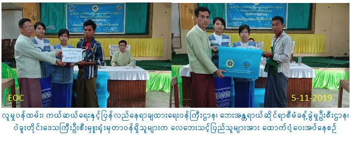 လူမှုဝန်ထမ်း၊ ကယ်ဆယ်ရေးနှင့်ပြန်လည်နေရာချထားရေးဝန်ကြီးဌာန၊ ဘေးအန္တရာယ် ဆိုင်ရာစီမံခန့်ခွဲမှု ဦးစီးဌာန၊ ပဲခူးတိုင်းဒေသကြီးဦးစီးမှူးရုံးမှ တာဝန်ရှိသူများသည် (၁-၁၁-၂၀၁၉) ရက်နေ့၌ ပဲခူးတိုင်းဒေသကြီး၊ သာယာဝတီခရိုင်၊ အုတ်ဖိုမြို့နယ်၊ မှက္ကတန်ကျေး ရွာအုပ်စု၊ မှက္ကတန်ကျေးရွာတွင် ဖြစ်ပွားခဲ့သော လေဘေးမှ ပြိုလဲနေအိမ် (၄) လုံးအတွက် အိမ်ဆောက်ပစ္စည်းဖိုးထောက်ပံ့ငွေ (၄၀၀၀၀၀/-) ကျပ်၊ ပြိုလဲအိမ်ထောင်စု(၄) စုရှိ လူဦးရေ (၂၃) ဦးတို့အတွက် ဆန်ရိက္ခာဖိုးထောက်ပံငွေ (၄၈၃၀၀/-)ကျပ် စုစုပေါင်းထောက်ပံ့ငွေ (၄၄၈၃၀၀/-) ကျပ် ကယ်ဆယ်ရေးပစ္စည်း (၁၆) မျိုး (ပလပ်စတစ်ပုံးအပါ) (၄) အိမ်ထောင် စာအား (၅-၁၁-၂၀၁၉) ရက်နေ့ (၁၂:ဝဝ) နာရီအချိန်တွင် အုတ်ဖိုမြို့နယ် အထွေထွေအုပ် ချုပ်ရေးဦးစီးဌာနရုံး၌ မြို့နယ်အထွေထွေအုပ်ချုပ်ရေးဦးစီးဌာနမှ တာဝန်ရှိသူများ၊ သက် ဆိုင်ရာကျေးရွာအုပ်ချုပ်ရေးမှူးနှင့်အတူ ပြည်သူလက်ဝယ်အရောက်သွားရောက်ထောက်ပံ့ ပေးအပ်ခဲ့ပါကြောင်း သတင်းရရှိပါသည်။