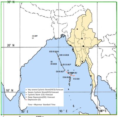 (၁) ယနေ့မြန်မာစံတော်ချိန် (၀၆:၃၀)နာရီအချိန် တိုင်းထွာချက်များအရ ဘင်္ဂလားပင်လယ် အော်အရှေ့အလယ်ပိုင်းနှင့် ယင်းနှင့် ဆက်စပ်လျက် ရှိသော ဘင်္ဂလားပင်လယ်အော် အရှေ့တောင်ပိုင်းတွင် ဖြစ်ပေါ်နေသော မုန်တိုင်းငယ်(Depression)သည် အနောက်ဘက်သို့ ရွေ့လျားခဲ့ပြီး၊ အိန္ဒိယနိုင်ငံ၊ မာယာဘန်ဒါမြို့(Maya Bandar) (ကပ္ပလီကျွန်း-Andaman Islands)၏ အနောက်-အနောက်မြောက်ဘက် ရေမိုင် (၁၈၀)မိုင်ခန့်၊ ပါရာဒစ်ပ် မြို့(Paradip)(ဩရိဿ-Odisha)၏ အရှေ့တောင်ဘက် ရေမိုင် (၄၆၀)မိုင်ခန့်၊ မြန်မာနိုင်ငံ၊ ပုသိမ်မြို့(Pathein)၏ အနောက်တောင်ဘက် ရေမိုင် (၃၅၅)မိုင်ခန့်နှင့် ဂွမြို့(Gwa)၏ အနောက်တောင်ဘက် ရေမိုင် (၃၈၀)မိုင်ခန့်အကွာ ပင်လယ်ပြင်ကို ဗဟိုပြုနေပါသည်။