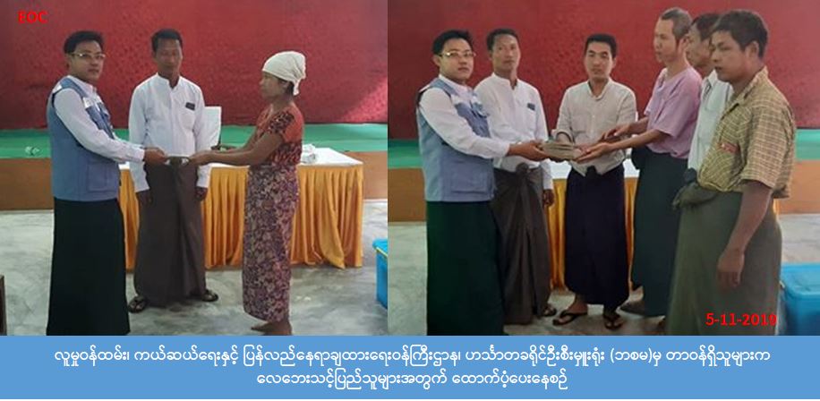 လူမှုဝန်ထမ်း၊ ကယ်ဆယ်ရေးနှင့် ပြန်လည်နေရာချထားရေးဝန်ကြီးဌာန၊ ဘေးအန္တရာယ်ဆိုင်ရာ စီမံခန့်ခွဲမှု ဦးစီးဌာန၊ ဟင်္သာတခရိုင်ဦးစီးမှူးရုံးမှ တာဝန်ရှိသူများသည် ဟင်္သာတခရိုင်၊ ဇလွန်မြို့နယ်၊ အုပ်ရှစ်ကွင်းအပ်စု၊ ရွာခွဲ(၆)ရွာနှင့် ဂျမ်းတိုက်အုပ်စုဘုရားကြီးကျေးရွာတွင် (၃၁-၁၁-၂၀၁၉) ရက်နေ့ လေပြင်းတိုက်ခတ်မှုကြောင့် အိမ်ခြေ (၁၀) လုံးအတွက် အိမ်ဆောက်ပစ္စည်းရန်ပုံငွေ (၆၃၀,၀၀ဝ) ဘေးသင့်လူဦးရေ(၄၅) ဦးအတွက် ဆန်ရိက္ခာ (၇) ရက်စာရန်ပုံငွေ (၉၄,၅၀ဝ)ကျပ်၊ စုစုပေါင်းကယ်ဆယ်ရေးရန်ပုံငွေ (၇၂၄,၅၀ဝ) ကျပ်ကို