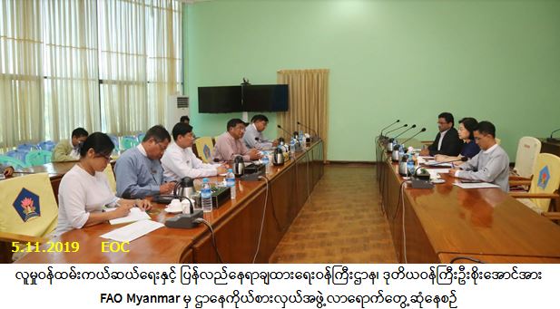 တွေ့ဆုံရာတွင် သဘာဝဘေးအန္တရာယ်ခံစားခဲ့ရသောဒေသများတွင် သီးနှံများ ပြန်လည်စိုက်ပျိုးနိုင်ရေး စားနပ်ရိက္ခာဖူလုံမှု၊ စိုက်ပျိုးရေးနှင့် ထိခိုက်လွယ်မှုများအား လေ့လာဆန်းစစ်မှု အခြေအနေများ၊ သဘာဝဘေးဒဏ်ခံနိုင်သော သီးနှံမျိုးစေ့များ သုတေသနပြုလုပ်နိုင်ရေး၊ ရာသီဥတုပြောင်းလဲမှု၏ အကျိုးဆက်ကြောင့် ပိုမိုများပြားလာသော သဘာဝဘေးအန္တရာယ်များကို တုံ့ပြန်ဆောင်ရွက်ရာတွင် ဘေးဒဏ်ကြံ့ကြံ့ခံနိုင်ရေး၊ ဘေးအန္တရာယ်ကြောင့် ထိခိုက်ဆုံးရှုံးနိုင်ခြေလျှော့ချရေးဆိုင်ရာကိစ္စများတွင် စိုက်ပျိုးရေး၊ မွေးမြူရေးနှင့် ဆည်မြောင်းဝန်ကြီးဌာန၊ လူမှုဝန်ထမ်း၊ ကယ်ဆယ်ရေးနှင့် ပြန်လည်နေရာချထားရေးဝန်ကြီးဌာနတို့နှင့် ပူးပေါင်းဆောင်ရွက်နိုင်ရေး၊ ပြည်တွင်းနေရပ်စွန့်ခွာသူများ ပြန်လည်နေရာချထားရေးအတွက် သက်မွေးဝမ်းကျောင်းလုပ်ငန်းများ၊ စိုက်ပျိုးမွေးမြူရေးလုပ်ငန်းများ၊ စိုက်ပျိုးနည်းပညာသင်တန်းများ၊ လိုအပ်သောစိုက်ပျိုးရေးပစ္စည်းများနှင့် မျိုးစေ့များပံ့ပိုးနိုင်ရေး အစရှိသည့်နယ်ပယ်များတွင် FAO နှင့် ပူးပေါင်းဆောင်ရွက်နိုင်ရေး၊ အသေးစိတ်စီမံချက်ဆိုင်ရာကိစ္စများ ဆောင်ရွက်နိုင်ရေးအတွက် လုပ်ငန်းအဆင့်တွေ့ဆုံညှိနှိုင်းမှုများ ဆက်လက်ပြုလုပ်နိုင်ရေးတို့နှင့်စပ်လျဉ်း၍ ဆွေးနွေးခဲ့ကြပါသည်။