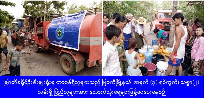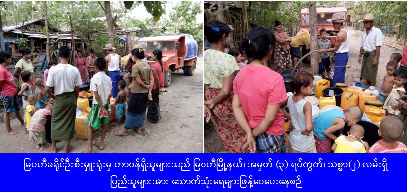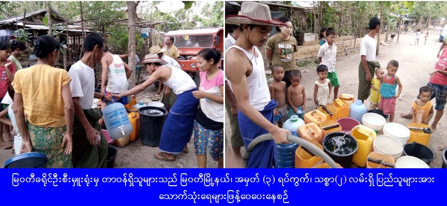 ကယ်ဆယ်ရေးနှင့် ပြန်လည်နေရာချထားရေးဦးစီးဌာန၊ မြဝတီခရိုင်ဦးစီးမှူးရုံးမှ တာဝန်ရှိသူများသည် (၁၇-၅-၂၀၁၆) ရက်နေ့တွင် မြဝတီမြို့နယ်၊ အမှတ် (၃) ရပ်ကွက်၊ သစ္စာ(၂) လမ်းရှိ ပြည်သူများအား သောက်သုံးရေဂါလန် (၁၀၀၀) အား ဖြန့်ဝေပေးခဲ့ကြောင်း သိရှိရပါသည်။