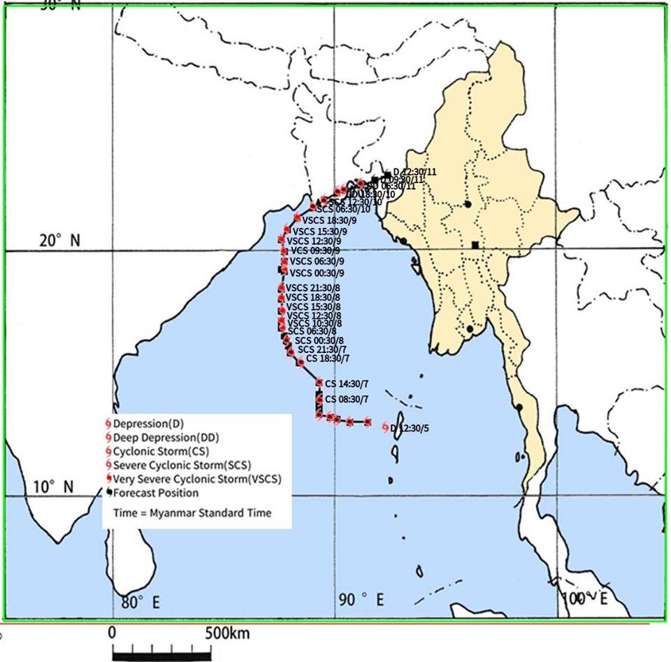(၁) ယနေ့မြန်မာစံတော်ချိန် (၀၆:၃၀)နာရီအချိန် တိုင်းထွာချက်များအရ ဘင်္ဂလားဒေ့ရှ် နိုင်ငံကမ်းခြေဒေသများကို ဖြတ်ကျော်ဝင်ရောက်ခဲ့သော အားကောင်းသော မုန်တိုင်းငယ် (Deep Depression)သည် ဘင်္ဂလားဒေ့ရှ်နိုင်ငံအရှေ့တောင်ပိုင်းသို့ ရောက်ရှိခဲ့ပြီး၊ မုန်တိုင်းငယ် (Depression)အဖြစ်သို့ အားလျော့သွားခဲ့ကာ အရှေ့-အရှေ့မြောက်ဘက်သို့ ဖြည်းညှင်းစွာ ရွေ့လျားလျက်ရှိပါသည်။