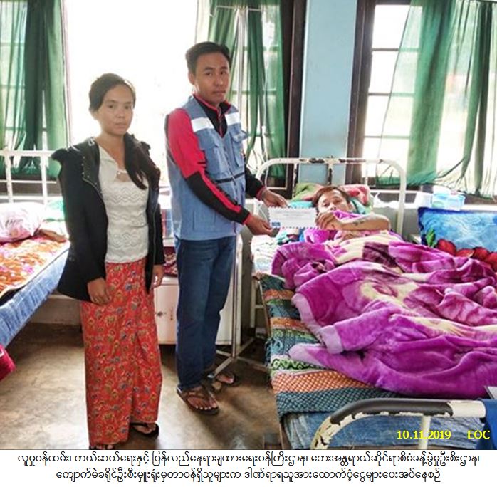 လူမှုဝန်ထမ်း၊ ကယ်ဆယ်ရေးနှင့် ပြန်လည်နေရာချထားရေးဝန်ကြီးဌာန၊ ဘေးအန္တရာယ်ဆိုင်ရာစီမံခန့်ခွဲမှုဦးစီး ဌာန၊ ကျောက်မဲခရိုင်ဦးစီးမှူးရုံးမှတာဝန်ရှိသူများသည် နမ့်ဆန်မြို့နယ်၊ နမ့်တွေကျေးရွာအုပ်စု၊ နမ့်တွေကျေးရွာ အနီး၌ (၇-၁၁-၂၀၁၉) ရက်နေ့တွင်ဖြစ်ပွားခဲ့သော မိုင်းနင်းဒါဏ်ရာရသူ (၁) ဦးအတွက် ဒါဏ်ရာရထောက်ပံ့ငွေ (၅၀,၀၀ဝ/-) ကျပ်ကို (၁၀-၁၁-၂၀၁၉) ရက်နေ့၊ (၁၂:၀၀) နာရီအချိန်တွင် ကျောက်မဲမြို့ပြည်သူ့ဆေးရုံကြီး၌ လက်ဝယ်အရောက် ထောက်ပံ့ပေးအပ်ခဲ့ပါကြောင်း သတင်းရရှိပါသည်။