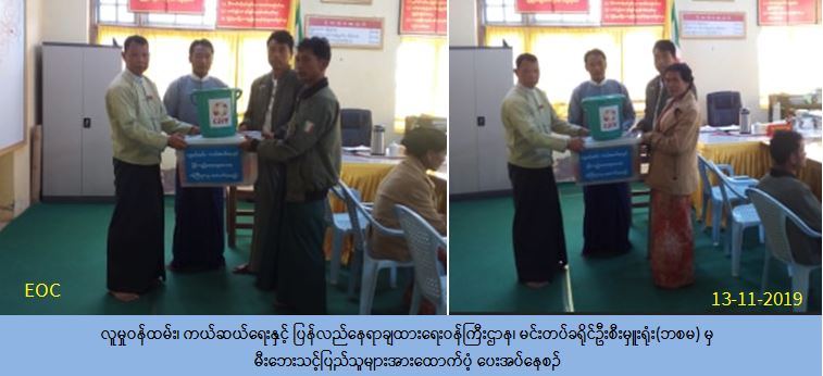 လူမှုဝန်ထမ်း၊ ကယ်ဆယ်ရေးနှင့် ပြန်လည်နေရာချထားရေးဝန်ကြီးဌာန၊ ဘေးအန္တရာယ် ဆိုင်ရာစီမံခန့်ခွဲမှုဦးစီးဌာန၊ မင်းတပ်ခရိုင်ဦးစီးမှူးရုံးမှ တာဝန်ရှိသူများသည် (၈-၁၁-၂၀၁၉) ရက်နေ့တွင် မင်းတပ်မြို့ အနောက်ရပ်ကွက်၌ မီးဘေးသင့်အိမ်ထောင်စု (၂) စု၊ လူဦးရေ (၁၁) ဦးတို့အတွက်အိမ်ဆောက်ပစ္စည်းဖိုးငွေ (၃၀၀,၀၀၀) ကျပ်၊ ဆန်ရိက္ခာဖိုးငွေ (၂၃,၁၀၀) ကျပ်၊ ကယ်ဆယ်ရေးပစ္စည်း (၁၆) မျိုးအိမ်ထောင်စု (၂) စုစာနှင့် ပလပ်စတစ် ပုံးလက်ကိုင်ပါ(၂) ပုံးတို့အား (၁၃-၁၁-၂၀၁၉) ရက်နေ့တွင် မြို့နယ်အထေွထေွအုပ်ချုပ်ရေးဦးစီးဌာနနဲ့ပူးပေါင်း၍ မီးဘေးသင့်ပြည်သူများထံ လက်ဝယ်အရောက် သွားရောက် ထောက်ပံ့ပေးအပ်ခဲ့ပါကြောင်း သိရှိရသည်။