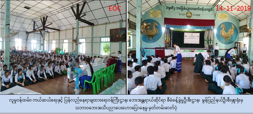 လူမှုဝန်ထမ်း၊ ကယ်ဆယ်ရေးနှင့် ပြန်လည်နေရာချထားရေးဝန်ကြီးဌာန၊ ဘေးအန္တရာယ်ဆိုင်ရာ စီမံခန့်ခွဲမှုဦးစီးဌာန၊ မွန်ပြည်နယ်ဦးစီးမှူးရုံးမှ တာဝန်ရှိသူများသည် (၁၃-၁၁-၂၀၁၉) ရက်နေ့ တွင် မော်လမြိုင်မြို့၊ လှိုင်ရပ်ကွက်၊ အ.ထ.က (၂) ၌ ကျောင်းသား/ကေျာင်းသူဦးရေ (၄၀၀) အား သဘာဝဘေးအသိပညာပေး ဟောပြောဆွေးနွေးခြင်း ပြုလုပ်ဆောင်ရွက်ခဲ့ပြီး လက်ကမ်း စာစောင်များ ဖြန့်ဝေပေးခဲ့ကြောင်း သတင်းရရှိပါသည်။
