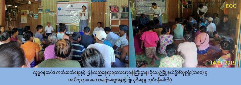လူမှုဝန်ထမ်း၊ ကယ်ဆယ်ရေးနှင့် ပြန်လည်နေရာချထားရေးဝန်ကြီးဌာန၊ ဘေးအန္တရာယ် ဆိုင်ရာစီမံခန့်ခွဲမှုဦးစီးဌာန၊ မိုင်းပျဉ်းမြို့နယ်ဦးစီးမှူးရုံးမှ တာဝန်ရှိသူများသည် ( ၁၃-၁၁-၂၀၁၉ )ရက်နေ့ နေ့လည် (၁၃:၀၀) မှ (၁၄:၃၀) အထိ မိုင်းပျဉ်းမြို့နယ် အလယ်ပိုင်းရပ်ကွက်၊ စွန်တောင်းကျေးရွာ၊ လူဦးရေ (၇၀) ဦးအား သဘာဝဘေးအသိပညာပေးဟောပြောဆွေး နွေးခဲ့ပါသည်။ အဆိုပါဟောပြောပွဲတွင် ဦးစီးဌာန၏ လုပ်ငန်းတာဝန်များ၊ ရည်ရွယ်ချက်များ၊ ထောက်ပံ့မှုနှုန်းထားများ၊ ဘေး (၈) မျိုး ဆောင်ရန်ရှောင်ရန်များ၊ ငလျင်လှုပ်ခတ်စဉ်အတွင်း နေထိုင်ရမည့်အနေအထားများအား လက်တွေ့သရုပ်ပြခြင်း၊ လက်ကမ်းစာစောင်များ ဖြန့်ဝေပေးခြင်းများကို ဆောင်ရွက်ခဲ့ပါကြောင်းသိရှိရပါသည်။