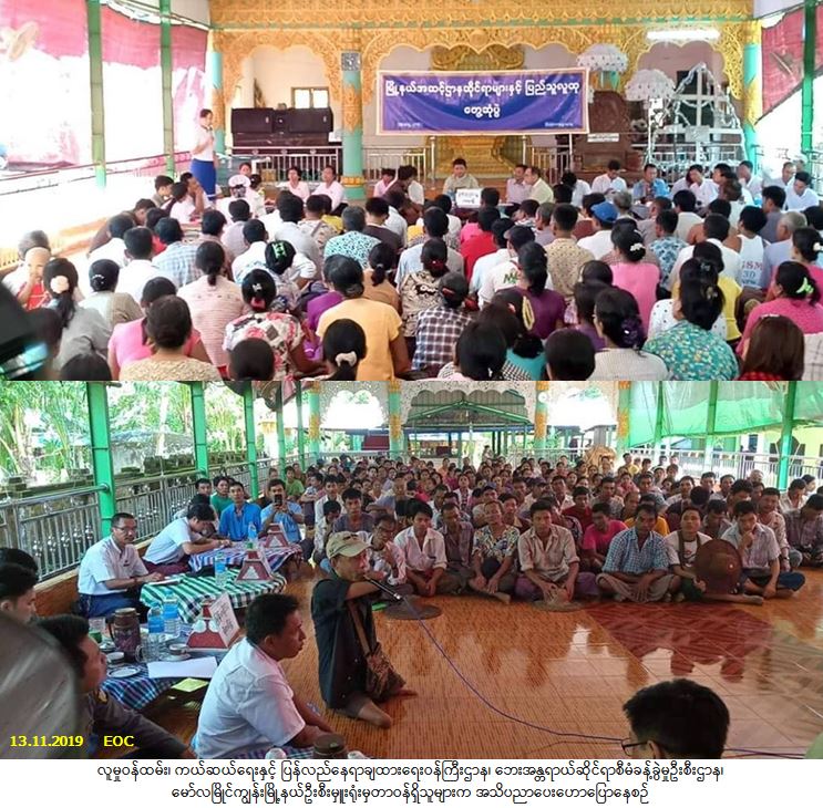 လူမှုဝန်ထမ်း၊ ကယ်ဆယ်ရေးနှင့် ပြန်လည်နေရာချထားရေးဝန်ကြီးဌာန၊ ဘေးအန္တရာယ်ဆိုင်ရာစီမံခန့်ခွဲမှုဦးစီး ဌာန၊ မော်လမြိုင်ကျွန်းမြို့နယ်ဦးစီးမှူးရုံးမှတာဝန်ရှိသူများသည် မြို့နယ်အဆင့်အခြားဌာနဆိုင်ရာများနှင့် ပူးပေါင်း၍ ပိဿာကျေးရွာအုပ်စု၊ ညောင်ချောင်းကျေးရွာ၌ (၁၃-၁၁-၂၀၁၉)ရက်နေ့၊ (၀၉:၀၀) နာရီအချိန်တွင် ကျေးရွာနေပြည်သူများ အသိပညာတိုးပွားစေရန်ရည်ရွယ်၍ ပြည်သူလူထုတွေ့ဆုံပွဲကိုကျင်းပပြုလုပ်ခဲ့ရာ ကျေးရွာနေပြည်သူ(၃၀၀)ဦးခန့်တက်ရောက်ခဲ့ပြီး တက်ရောက်လာသူများအား သဘာဝဘေးအန္တရာယ် လျော့ပါးရေးဆိုင်ရာ အသိပညာပေးဆွေးနွေးခြင်းတို့ ဆောင်ရွက်ခဲ့ပါကြောင်းသတင်းရရှိပါသည်။