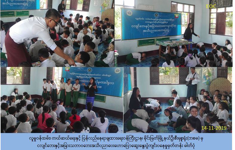 လူမှုဝန်ထမ်း၊ ကယ်ဆယ်ရေးနှင့် ပြန်လည်နေရာချထားရေးဝန်ကြီးဌာန၊ ဘေးအန္တရာယ် ဆိုင်ရာစီမံခန့်ခွဲမှုဦးစီးဌာန၊ မိုင်းဖြတ်မြို့နယ်ဦးစီးမှူးရုံးမှ တာဝန်ရှိသူများသည် (၁၄-၁၁-၂၀၁၉) ရက်နေ့ နံနက် (၁၀:၀၀) နာရီ မှ (၁၁:၃၀) နာရီအထိ အခြေခံပညာမူလ တန်းကျောင်း ဝမ်ပုံတွင် ဆရာ၊ ဆရာမ ၊ ကျောင်းသား၊ ကျောင်းသူ စုစုပေါင်း (၈၀) ဦး အား ငလျင်ဘေးနှင့်အခြားသဘာဝဘေးများဆိုင်ရာအသိပညာပေးဟောပြောပွဲကို ပြုလုပ်ဆောင် ရွက်ခဲ့ပါသည်။အဆိုပါဟောပြောပွဲတွင် ဦးစီးဌာန၏ လုပ်ငန်းတာဝန်များ၊ ရည်ရွယ်ချက်များ၊ ထောက်ပံ့မှုနှုန်းထားများ၊ ဘေး (၈) မျိုး ဆောင်ရန် ရှောင်ရန်များ၊ ငလျင်ဘေးနှင့်ပတ်သက်၍ လက်တွေ့သရုပ်ပြခြင်း၊ လိုက်ပါဆောင်ရွက်စေခြင်း၊ ဘေး(၈) မျိုးလက်ကမ်းစာစောင်များဖြန့်ဝေပေးခြင်းများ ဆောင်ရွက်ခဲ့ပါကြောင်း သိရှိရပါသည်။