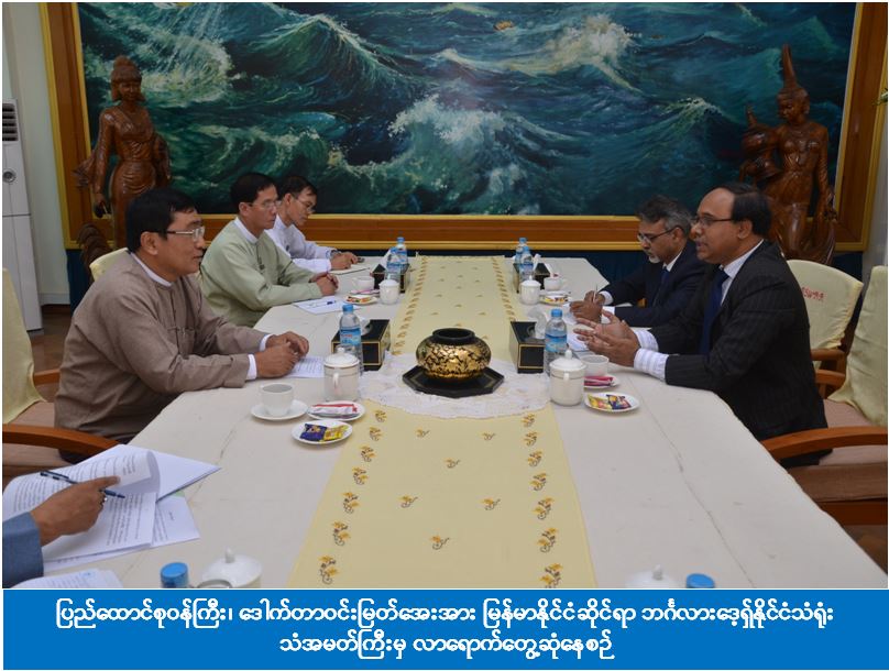 လူမှုဝန်ထမ်း၊ ကယ်ဆယ်ရေးနှင့် ပြန်လည်နေရာချထားရေးဝန်ကြီးဌာန၊ မေခလာခန်းမတွင် မေလ (၁၈) ရက်နေ့၊ နေ့လည်(၁၃:၀၀) နာရီအချိန်က ပြည်ထောင်စုဝန်ကြီး ဒေါက်တာ ဝင်းမြတ်အေးအား ရန်ကုန်မြို့၊ မြန်မာနိုင်ငံဆိုင်ရာ ဘင်္ဂလားဒေ့ရှ်နိုင်ငံသံရုံးမှ သံအမတ်ကြီးဖြစ်သူ H.E.Mr. Mohammad Sufiur Rahman ဦးဆောင်သောအဖွဲ့မှ လာရောက်တွေ့ဆုံခဲ့ပါသည်။ ထိုသို့တွေ့ဆုံရာ၌ ဘင်္ဂလားဒေ့ရှ်နိုင်ငံံ၏ သဘာဝဘေးအန္တရာယ်များအတွက် ကြိုတင်ပြင်ဆင်ရာတွင် စားနပ်ရိက္ခာစုဆောင်းထားရှိမှုနှင့်ပတ်သက်၍ ၎င်းတို့နိုင်ငံ၏ ရှေးရိုးစဉ်လာ ဆောင်ရွက်မှုအတွေ့အကြုံများ၊ ရခိုင်ပြည်နယ်အတွင်းရှိ ဒုက္ခသည်များအတွက် ကူညီပေးခြင်းဆိုင်ရာကိစ္စရပ်များ၊ ရာသီဥတုပြောင်းလဲမှုကြောင့်ဖြစ်ပေါ်လာသည့် သဘာဝဘေးအန္တရာယ်များကို နှစ်နိုင်ငံပူးပေါင်းတုန့်ပြန်ဆောင်ရွက်မည့် ကိစ္စရပ်များကို ရင်းနှီးပွင့်လင်းစွာဆွေးနွေးခဲ့ကြပါသည်။