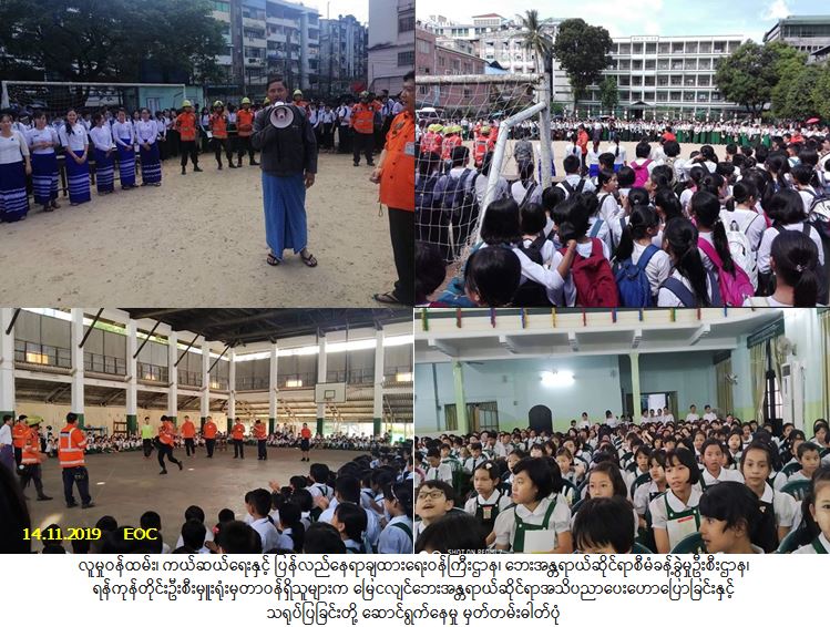 လူမှုဝန်ထမ်း၊ ကယ်ဆယ်ရေးနှင့် ပြန်လည်နေရာချထားရေးဝန်ကြီးဌာန၊ ဘေးအန္တရာယ်ဆိုင်ရာစီမံခန့်ခွဲမှုဦးစီး ဌာန၊ ရန်ကုန်တိုင်းဦးစီးမှူးရုံးမှတာဝန်ရှိသူများနှင့် မြန်မာနိုင်ငံငလျင်ကော်မတီ၊ ရန်ကုန်လူမှုကူညီကယ်ဆယ်ရေး အဖွဲ့ (YRO) တို့နှင့်ပူးပေါင်း၍ (၁၄-၁၁-၂၀၁၉) ရက်နေ့၊ နံနက်(၁၀:၀၀) နာရီအချိန်တွင် ဒဂုံမြို့နယ်၊ အ.ထ.က(၁)ကျောင်း၌ မြေငလျင်ဘေးအန္တရာယ်ဆိုင်ရာအသိပညာပေးဟောပြောခြင်းနှင့် သရုပ်ပြခြင်းအစီအစဉ် ကို ကျောင်းသား/ကျောင်းသူ (၆၀၀)ဦးခန့်တို့ကိုလည်းကောင်း၊ နေလယ် (၁၂:၃၀) နာရီအချိန်တွင် မူလတန်းကျောင်းသား/ကျောင်းသူ (၉၅၀) ဦးတို့ကိုလည်းကောင်း အသိပညာပေးဟောပြောသရုပ်ပြ လေ့ကျင့်ခြင်းတို့ ဆောင်ရွက်ခဲ့ပါကြောင်း သတင်းရရှိပါသည်။
