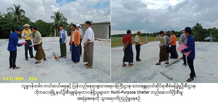 လူမှုဝန်ထမ်း၊ ကယ်ဆယ်ရေးနှင့် ပြန်လည်နေရာချထားရေးဝန်ကြီးဌာန၊ ဘေးအန္တရာယ်ဆိုင်ရာစီမံခန့်ခွဲမှုဦးစီး ဌာန၊ ဘိုကလေးမြို့နယ်ဦးစီးမှူးရုံးမှတာဝန်ရှိသူများသည် Shelter တည်ဆောက်ရေးကြီးကြပ်မှုကော်မတီ အဖွဲ့ဝင်များနှင့်အတူ (၁၄-၁၁-၂၀၁၉) ရက်နေ့တွင် ဘိုကလေးမြို့နယ်၊ ဟေမာန်ကျေးရွာအုပ်စု ကျုံလွတ်ကြီးကျေးရွာ၌ Multi-Purpose Shelter (၇၅) ရာခိုင်းနှုန်းပြီးစီးမှုကို သွားရောက်ကွင်းဆင်း ကြည့်ရှုခဲ့ပါကြောင်း သတင်းရရှိပါသည်။