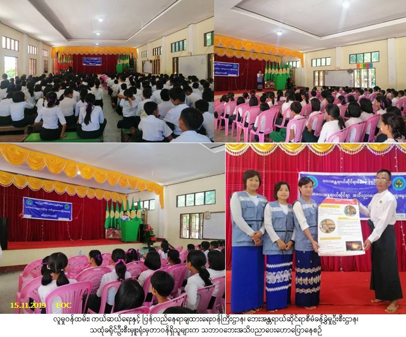 လူမှုဝန်ထမ်း၊ ကယ်ဆယ်ရေးနှင့် ပြန်လည်နေရာချထားရေးဝန်ကြီးဌာန၊ ဘေးအန္တရာယ်ဆိုင်ရာစီမံခန့်ခွဲမှုဦးစီး ဌာန၊ သထုံခရိုင်ဦးစီးမှူးရုံးမှတာဝန်ရှိသူများသည် (၁၅-၁၁-၂၀၁၉) ရက်နေ့၊ (၁ဝ:၀၀)နာရီမှ (၁၂:၀၀) နာရီအချိန်အထိ မွန်ပြည်နယ်၊ ပေါင်မြို့နယ်၊ အခြေခံပညာအထက်တန်းကျောင်း၊ အ.ထ.က(ကျွဲခြံ)၌ သဘာဝဘေးအန္တရာယ်နှင့်စပ်လျဉ်း၍ အသိပညာပေးဟောပြောဆွေးနွေးခြင်း၊ နံရံကပ်ပိုစတာများကပ်ခြင်း တို့ဆောင်ရွက်ခဲ့ရာ ကျောင်းသား/သူ စုစုပေါင်း(၃၀၀) ဦးခန့်တက်ရောက်ခဲ့ပါကြောင်းသတင်းရရှိပါသည်။