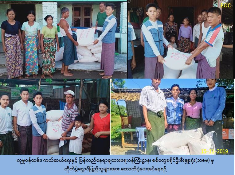 လူမှုဝန်ထမ်း၊ ကယ်ဆယ်ရေးနှင့် ပြန်လည်နေရာချထားရေးဝန်ကြီးဌာန၊ ဘေးအန္တရာယ် ဆိုင်ရာစီမံခန့်ခွဲမှုဦးစီးဌာန၊ စစ်တွေခရိုင်ဦးစီးမှူးရုံးမှ တာဝန်ရှိသူများသည် ရခိုင်ပြည်နယ် အတွင်း တိုက်ပွဲများဖြစ်ပွားမှုကြောင့် ယာယီခိုလှုံနေထိုင်လျက်ရှိသည့် စစ်တွေမြို့နယ်၊ တိုက်ပွဲရှောင်စုရပ် (၇) ခုမှ တိုက်ပွဲရှောင် အိမ်ထောင်စု (၆၅) စု၊ လူဦးရေ (၂၃၇) ဦးအတွက် ဆန်ရိက္ခာ (၁) လစာ ဆန် (၇၄) အိတ်၊ (၁) ပြည်၊ (၄) ဗူးအား (၁၄-၁၁-၂၀၁၉) ရက်တွင် ပြည်သူ့လက်ဝယ်အရောက်သွားရောက်ထောက်ပံ့ပေးအပ်ခဲ့ပါကြောင်းသတင်းရရှိပါသည်။
