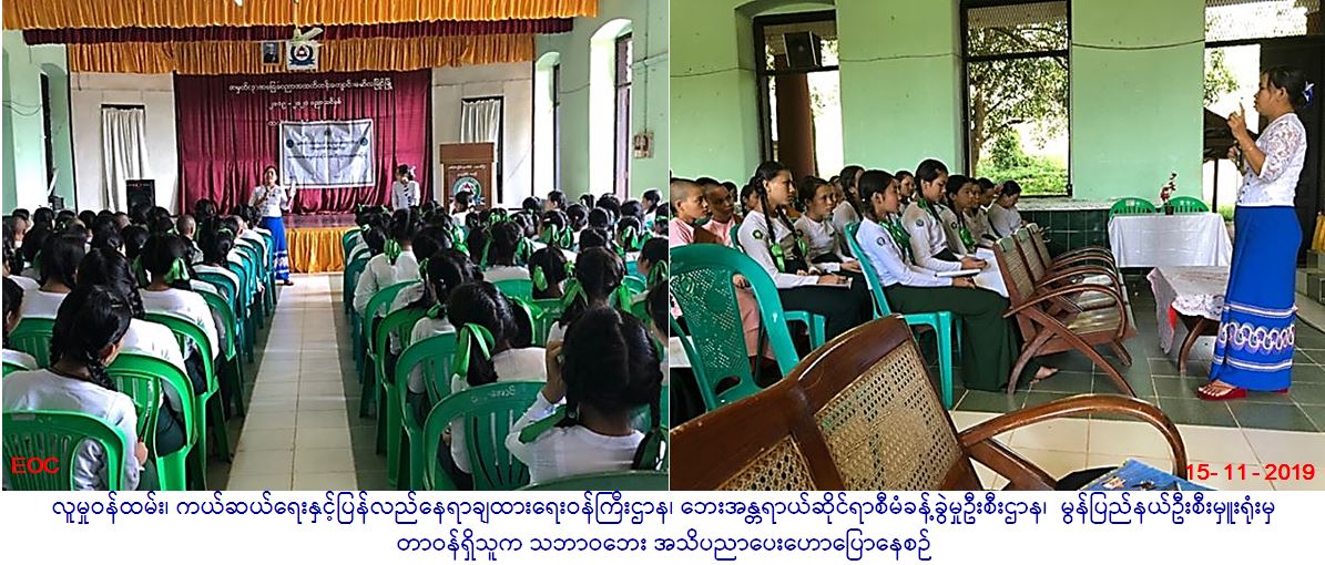 လူမှုဝန်ထမ်း၊ ကယ်ဆယ်ရေးနှင့်ပြန်လည်နေရာချထားရေးဝန်ကြီးဌာန၊ ဘေးအန္တရာယ်ဆိုင်ရာစီမံခန့်ခွဲမှုဦးစီးဌာန၊ မွန်ပြည်နယ် ဦးစီးမှူးရုံးမှ တာဝန်ရှိသူများသည် (၁၅.၁၁.၂၀၁၉) ရက်နေ့ (၁၃:၀၀)နာရီမှ (၁၄:၃၀)နာရီထိ မော်လမြိုင်မြို့နယ်၊ မရမ်းကုန်းရပ်ကွက် အမှတ်(၃)အခြေခံပညာအထက်တန်းကျောင်း သဘာဝဘေးအသိပညာပေးဟောပြောဆွေးနွေးပွဲဆောင်ရွက်ခဲ့ရာ ဆရာမနှင့် ကျောင်းသူ (၃၀၀) ဦးခန့် တက်ရောက်ခဲ့ပါကြောင်း သတင်းရရှိပါသည်။
