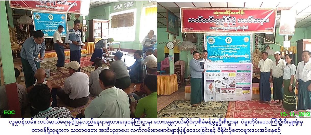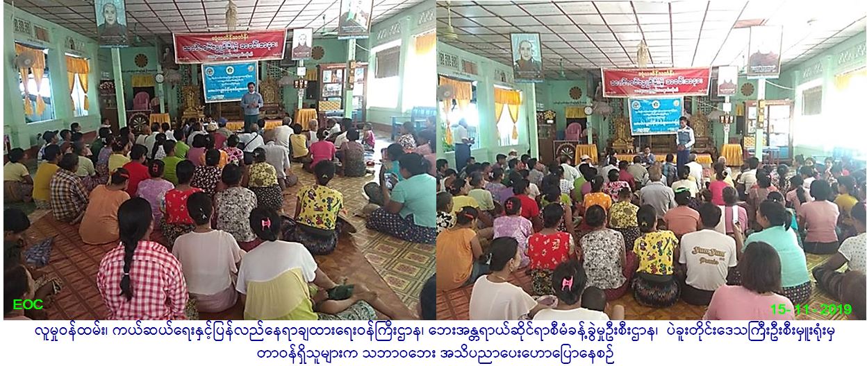 လူမှုဝန်ထမ်း၊ ကယ်ဆယ်ရေးနှင့်ပြန်လည်နေရာချထားရေးဝန်ကြီးဌာန၊ ဘေးအန္တရာယ်ဆိုင်ရာစီမံခန့်ခွဲမှုဦးစီးဌာန၊ ပဲခူးတိုင်း ဒေသကြီးဉီးစီးမှူးရုံးမှ တာဝန်ရှိသူများသည် (၁၅.၁၁.၂၀၁၉) ရက်နေ့၌ ပဲခူးတိုင်းဒေသကြီး၊ သနပ်ပင်မြို့နယ်၊ စက်ကုန်း ပိုင်းရပ်ကွက်၊ အနောမာရုံကွင်းကျောင်းဓမ္မာရုံတွင် (၁၃း၀၀)နာရီမှ (၁၄း၃၀)နာရီအချိန်ထိ သဘာဝဘေးအန္တရာယ်နှင့် ပတ်သက်၍ ဆောင်ရန်၊ ရှောင်ရန်များအား အသိပညာပေးဟောပြောခြင်း၊ လက်ကမ်းစာစောင်များနှင့် ဗလာစာအုပ်များ ဝေဌခြင်းတို့ပြုလုပ်ခဲ့ရာ ရပ်ကွက်အုပ်ချုပ်ရေးမှူးနှင့် ရပ်ကွက်သူ၊ ရပ်ကွက်သား (၁၅၀)ဦးတို့တက်ရောက်ခဲ့ပါကြောင်း သတင်း ရရှိပါသည်။