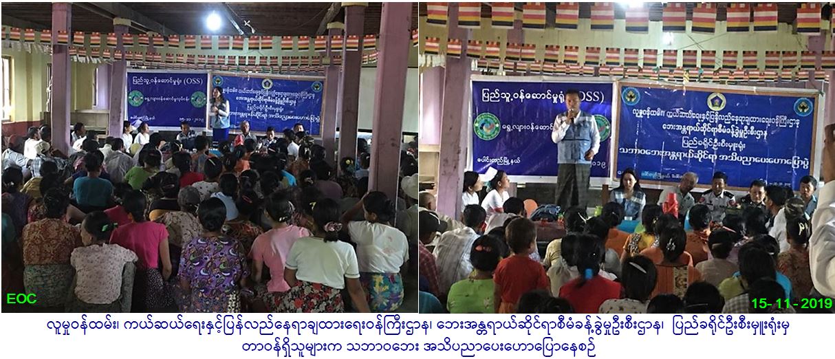 လူမှုဝန်ထမ်း၊ ကယ်ဆယ်ရေးနှင့် ပြန်လည်နေရာချထားရေးဝန်ကြီးဌာန၊ ဘေးအန္တရာယ်ဆိုင်ရာစီမံခန့်ခွဲမှုဦးစီးဌာန၊ ပြည်ခရိုင် ဦးစီးမှူးရုံးမှ တာဝန်ရှိသူများသည် (၁၅-၁၁-၂၀၁၉) ရက်နေ့၊ (၁၃:၀၀)နာရီမှ (၁၅:၀၀)နာရီအချိန်အထိ ပြည်ခရိုင်၊ ပေါင်းတည် မြို့နယ်၊ မဲခေါင်းကျေးရွာအုပ်စု၊ ခြောက်လုံးပြူးကျေးရွာ၌ သဘာဝဘေးအန္တရာယ်နှင့်စပ်လျဉ်း၍ အသိပညာပေးဟောပြော ဆွေးနွေးခြင်း၊ နံရံကပ်ပိုစတာများပေးအပ်ခြင်း၊လက်ကမ်းစာစောင်များပေးဝေခြင်း၊ ခေါက်ဆွဲခြောက်များပေးဝေခြင်းတို့ ဆောင်ရွက်ခဲ့ရာ ကျေးရွာသူ /သား စုစုပေါင်း (၁၅၀) ဦးခန့်တက်ရောက်ခဲ့ပါကြောင်း သတင်းရရှိပါသည်။