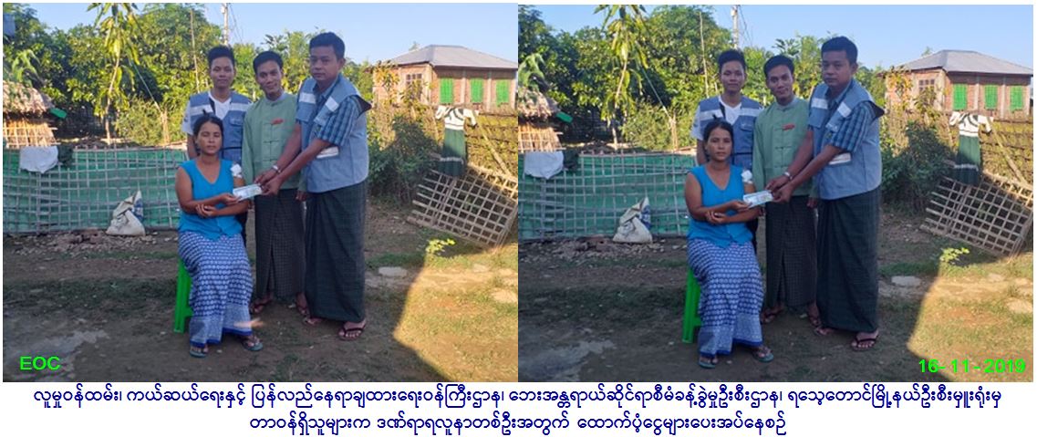 လူမှုဝန်ထမ်း၊ ကယ်ဆယ်ရေးနှင့် ပြန်လည်နေရာချထားရေးဝန်ကြီးဌာန၊ ဘေးအန္တရာယ်ဆိုင်ရာစီမံခန့်ခွဲမှုဦးစီးဌာန၊ ရသေ့ တောင်မြို့နယ်ဦးစီးမှူးရုံးမှ တာဝန်ရှိသူများသည် (၁၆.၁၁.၂၀၁၉) ရက်နေ့တွင် ရသေ့တောင်မြို့၊ ငတောက်တူချေကျေးရွာနေ ဒေါ်အေးသိန်းလှိုင်၊ အသက် (၃၃)နှစ် လက်မောင်းကျည်ထိမှန် ဒဏ်ရာရအတွက် ထောက်ပံ့ငွေ (၅၀၀၀၀/-) ကျပ်တို့ကို ဒဏ်ရာရလူနာ လက်ဝယ်အရောက်ထောက်ပံ့ပေးအပ်ခဲ့ပါကြောင်း သတင်းရရှိပါသည်။