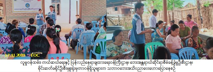 လူမှုဝန်ထမ်း၊ ကယ်ဆယ်ရေးနှင့် ပြန်လည်နေရာချထားရေးဝန်ကြီးဌာန၊ ဘေးအန္တရာယ်ဆိုင်ရာစီမံခန့်ခွဲမှုဦးစီး ဌာန၊ မိုင်းဆတ်ခရိုင်ဦးစီးမှူးရုံးမှတာဝန်ရှိသူများသည် (၁၇-၁၁-၂၀၁၉) ရက်နေ့၊ နံနက် (၁၀:၀၀) နာရီချိန်တွင် မိုင်းခုတ်မြို့နယ်၊ လွယ်ဆောင်းကျေးရွာအုပ်စု၊ လွယ်ဆောင်ကျေးရွာ၌ သဘာဝဘေးအန္တရာယ်ဆိုင်ရာ အသိပညာပေးဟောပြောပွဲကျင်းပပြုလုပ်ခဲ့ရာ ကျေးရွာသူ/သား (၅၀)ဦးခန့်တက်ရောက်ခဲ့ပြီး တက်ရောက်လာ သူများအား လက်ကမ်းစာစောင်များဖြန့်ဝေပေးခဲ့ပါကြောင်း သတင်းရရှိပါသည်။