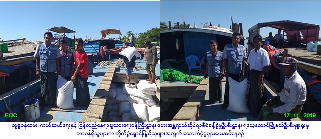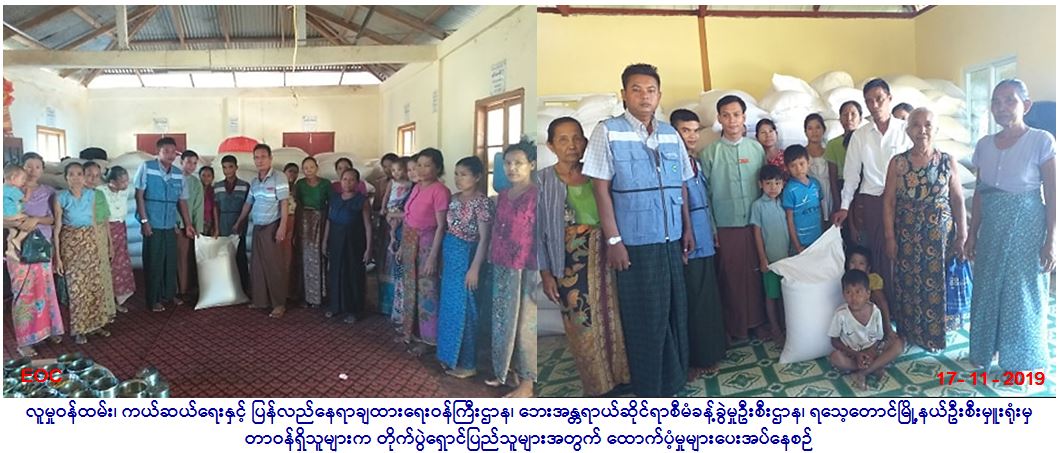 လူမှုဝန်ထမ်း၊ ကယ်ဆယ်ရေးနှင့် ပြန်လည်နေရာချထားရေးဝန်ကြီးဌာန၊ ဘေးအန္တရာယ်ဆိုင်ရာစီမံခန့်ခွဲမှုဦးစီးဌာန၊ ရသေ့ တောင်မြို့နယ်ဦးစီးမှူးရုံးမှ တာဝန်ရှိသူများသည် ရခိုင်ပြည်နယ်၊ ရသေ့တောင်မြို့နယ်အတွင်းရှိ တိုက်ပွဲရှောင်ပြည်သူများ နေရပ်စွန့်ခွာပြီး ယာယီခိုလှုံနေထိုင်လျက်ရှိသည့် စုရပ်(၅)ခု တောင်ရင်းတန်း ရပ်ကွက်၊အရှေ့မြောက်ရပ်ကွက်၊ ချောင်းဝရပ်ကွက်၊ မှန်နီပြင်ကျေးရွာ နှင့်အောက်ကျောင်းတောင်ကျေးရွာ ရှိတိုက်ပွဲရှောင် အိမ်ထောင်စု (၁၁၁၂) စု၊ လူဦးရေ (၄၄၀၈) ဦးအတွက် ဆန်ရိက္ခာ (၁) လစာ ဆန် (၁၃၇၇) အိတ် (၁၂) ပြည်တို့ကို (၁၇.၁၁.၂၀၁၉) ရက်တွင် ရပ်ကျေးအုပ်ချုပ်ရေးမှူးတို့ဖြင့် တိုက်ပွဲ ရှောင်ပြည်သူများအတွက် ထောက်ပံ့ပေးအပ်ခဲ့ပါကြောင်း သတင်းရရှိပါသည်။
