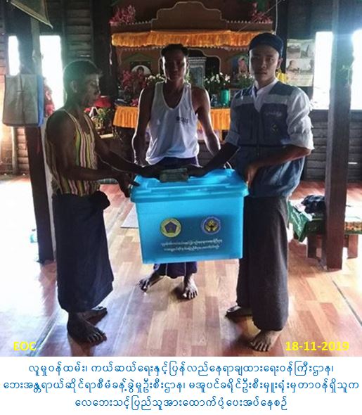 လူမှုဝန်ထမ်း၊ ကယ်ဆယ်ရေးနှင့်ပြန်လည်နေရာချထားရေးဝန်ကြီးဌာန၊ ဘေးအန္တရာယ်ဆိုင်ရာစီမံခန့်ခွဲမှုဦးစီးဌာန၊ မအူပင်ခရိုင်ဦးစီးမှူးရုံးမှ တာဝန်ရှိသူများသည် မအူပင်ခရိုင်၊ ပန်းတနော်မြို့နယ်၊ ဘုရားချောင်းကျေးရွာအုပ်စု၊ မအူချောင်းကျေးရွာ၌ (၁၅-၁၁-၂၀၁၉) ရက်နေ့တွင် ဖြစ်ပွားခဲ့သော လေဘေးကြောင့် ပြိုကျပျက်စီးခဲ့သည့် နေအိမ်(၁)လုံး၊ အိမ်ထောင်(၁) စုမှ လူဦးရေ (၂) ဦးအတွက် ကယ်ဆယ်ရေးပစ္စည်း (၁၆) မျိုးပါ (၁) ပုံး နှင့်အိမ်ဆောက်ပစ္စည်းဖိုးထောက်ပံ့ငွေ (၁၀၀၀၀ဝ/-) ကျပ်၊ ဆန်ရိက္ခာဖိုးထောက်ပံ့ငွေ (၄၂၀ဝ/-) ကျပ်၊ စုစုပေါင်းထောက်ပံ့ငွေ (၁၀၄၂၀ဝ/-) ကျပ် အား (၁၈-၁၁-၂၀၁၉) ရက်နေ့ (၁၄:၃၀) နာရီအချိန်တွင် ဘေးသင့်သူများအား ထောက်ပံ့ပေးအပ်ခဲ့ပါကြောင်း သတင်း ရရှိပါသည်။