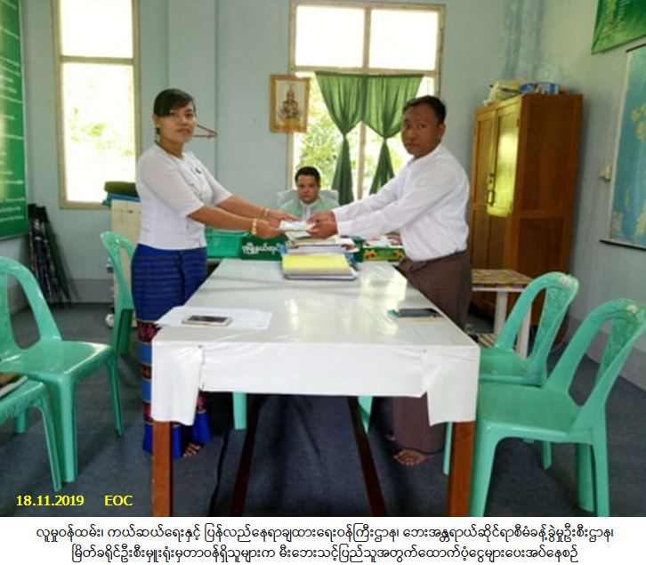 လူမှုဝန်ထမ်း၊ ကယ်ဆယ်ရေးနှင့် ပြန်လည်နေရာချထားရေးဝန်ကြီးဌာန၊ ဘေးအန္တရာယ်ဆိုင်ရာစီမံခန့်ခွဲမှုဦးစီး ဌာန၊ မြိတ်ခရိုင်ဦးစီးမှူးရုံးမှတာဝန်ရှိသူများသည် ကျွန်းစုမြို့နယ်၊ စခန်းသစ်ကျေးရွာအုပ်စု၊ စခန်းသစ်ကျေးရွာ၌ (၁၇-၁၁-၂၀၁၉) ရက်နေ့တွင်ဖြစ်ပွားခဲ့သော မီးဘေးကြောင့် တစ်စိတ်တစ်ပိုင်းပျက်စီးနေအိမ်(၁) လုံး၊ အိမ်ထောင်စု (၁) စုမှ လူဦးရေ (၂) ဦး ဘေးသင့်ခဲ့ရာ အဆိုပါဘေးသင့်ပြည်သူအတွက် အိမ်ဆောက်ပစ္စည်း ဖိုးထောက်ပံ့ငွေ (၇၀,၀၀၀/-) ကျပ်ကို (၁၈-၁၁-၂၀၁၉) ရက်နေ့၊ (၁၀:၀၀) နာရီအချိန်တွင် သွားရောက် ထောက်ပံ့ပေးအပ်ခဲ့ပါကြောင်း သတင်းရရှိပါသည်။
