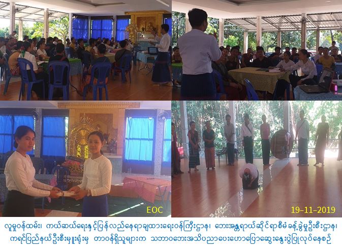လူမှုဝန်ထမ်း၊ ကယ်ဆယ်ရေးနှင့် ပြန်လည်နေရာချထားရေးဝန်ကြီးဌာန၊ ဘေးအန္တရာယ်ဆိုင်ရာ စီမံခန့်ခွဲမှုဦးစီးဌာန၊ ကရင်ပြည်နယ်ဦးစီးမှူးရုံးမှ တာဝန်ရှိသူများသည် (၁၉-၁၁-၂၀၁၉) ရက်နေ့တွင် လှိုင်းဘွဲမြို့နယ်၊ ပိုင်ကျုံမြို့၊ ဘုရားကုန်းကျေးရွာသို့ သွားရောက်၍ ဆရာ၊ ဆရာမ ၊ ကျေးရွာသူ၊ ကျေးရွာသား တက်ရောက်သူ (၆၅) ဉီး တို့အား ငလျင်ဘေး၊ မိုးကြိုးဘေး၊ မုန်တိုင်းဘေး၊ ရေဘေးနှင့်ပတ်သက်၍ ဆောင်ရန်၊ ရှောင်ရန် အချက်များအား အသိပညာပေးဆွေးနွေးဟောပြောခဲ့ပြီး လက်ကမ်းစာစောင်များ၊ ပိုစတာများဖြန့်ဝေပေး ခဲ့ပါကြောင်း သတင်းရရှိပါသည်။