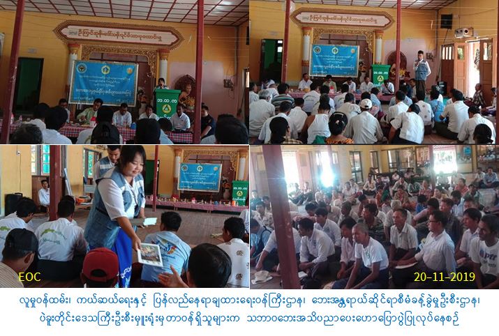 လူမှုဝန်ထမ်း၊ ကယ်ဆယ်ရေးနှင့် ပြန်လည်နေရာချထားရေးဝန်ကြီးဌာန၊ ဘေးအန္တရာယ်ဆိုင်ရာစီမံခန့်ခွဲမှုဦးစီးဌာန၊ ပဲခူးတိုင်းဒေသကြီးဦးစီးမှူးရုံးမှ တာဝန်ရှိသူများသည် ပဲခူးတိုင်းဒေသကြီး၊ သာယာဝတီခရိုင်၊ အုတ်ဖိုမြို့နယ်၊ ဂုံညင်းတန်းကျေးရွာအုပ်စု၊ ဂုံညင်းတန်းကျေးရွာ၊ ဂုံညင်းတန်းရွာမဓမ္မရရိပ်သာကျောင်း၌ (၂၀-၁၁-၂၀၁၉) ရက်နေ့ (၁၁:၀၀) နာရီအချိန်မှ (၁၂:၃၀) နာရီအချိန်ထိ သဘာဝဘေးအန္တရာယ်နှင့်စပ်လျဉ်း၍ ဆောင်ရန်/ ရှောင်ရန်များအား အသိပညာပေးဟောပြောခြင်း၊ မီး၊ ရေ၊ လေ၊ ငလျင်ပိုစတာများ၊ မီး၊ ရေ၊ မိုးကြိုး၊ မုန်တိုင်း ဗီနိုင်းများ၊ ငလျင်ယပ်တောင်များ၊ ငလျင်ဇာတ်တိုက်စာအုပ်များ၊ ငလျင်ရုပ်ပြစာအုပ်များနှင့် လက်ကမ်းစာစောင်များအား ဖြန့်ဝေခြင်းတို့ပြုလုပ်ခဲ့ရာ အုတ်ဖိုမြို့နယ်အထွေထွေအုပ်ချုပ် ရေးဦးစီးဌာနမှတာဝန်ရှိသူမျး၊ ရပ်ကွက်အုပ်ချူပ်ရေးမှူး၊ မြို့နယ်အဆင့်ဌာနဆိုင်ရာများနှင့် ကျေးရွာသူ/ သား (၁၅၀) ဦးခန့် တက်ရောက်ခဲ့ပါကြောင်း သတင်းရရှိပါသည်။