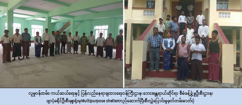 လူမှုဝန်ထမ်း၊ ကယ်ဆယ်ရေးနှင့် ပြန်လည်နေရာချထားရေးဝန်ကြီးဌာန၊ ဘေးအန္တရာယ်ဆိုင်ရာ စီမံခန့်ခွဲ့မှုဦးစီးဌားန၊ ဖျာပုံခရိုင်ဦးစီးမှူးရုံးမှ တာဝန်ရှိသူများသည် (၂၀-၁၁-၂၀၁၉ ) ရက်နေ့တွင် ဘိုကလေးမြို့နယ်၊ ကြိမ်ချောင်းကြီးကျေးရွာအုပ်စု၊ ကြိမ်ချောင်းကြီးကျေးရွာတွင် ဥဒေါင်းနေ ခြည်ကုမ္ပဏီမှ တာဝန်ယူတည်ဆောက်နေသော Multipurpose shelter တည်ဆောက်မှုလုပ် ငန်းပြီးစီး၍ ဖျာပုံခရိုင်၊ ဘေးအန္တရာယ်ဆိုင်ရာစီမံခန့်ခွဲမှုစီးဌာနနှင့် ကျေးရွာအုပ်ချုပ်ရေးမှူး၊ ရပ်မိရပ်ဖများ၊ ကျေးရွာတာဝန်ခံများအား လွှဲပြောင်းပေးအပ်ခဲ့ကြောင်းသတင်းရရှိပါသည်။